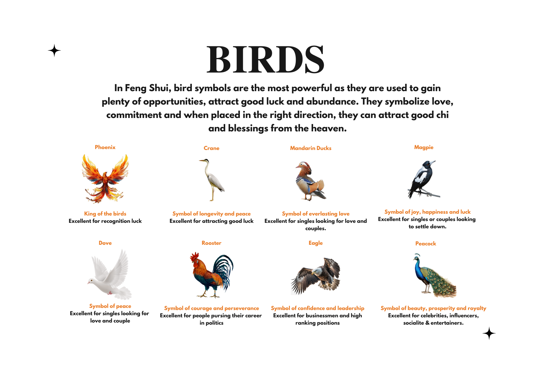 In Feng Shui, bird symbols are the most powerful used to gain plenty of opportunities, attract good luck and abundance. They symbolise love, commitment and when placed in the right direction they can attract good chi plus blessings from heaven.