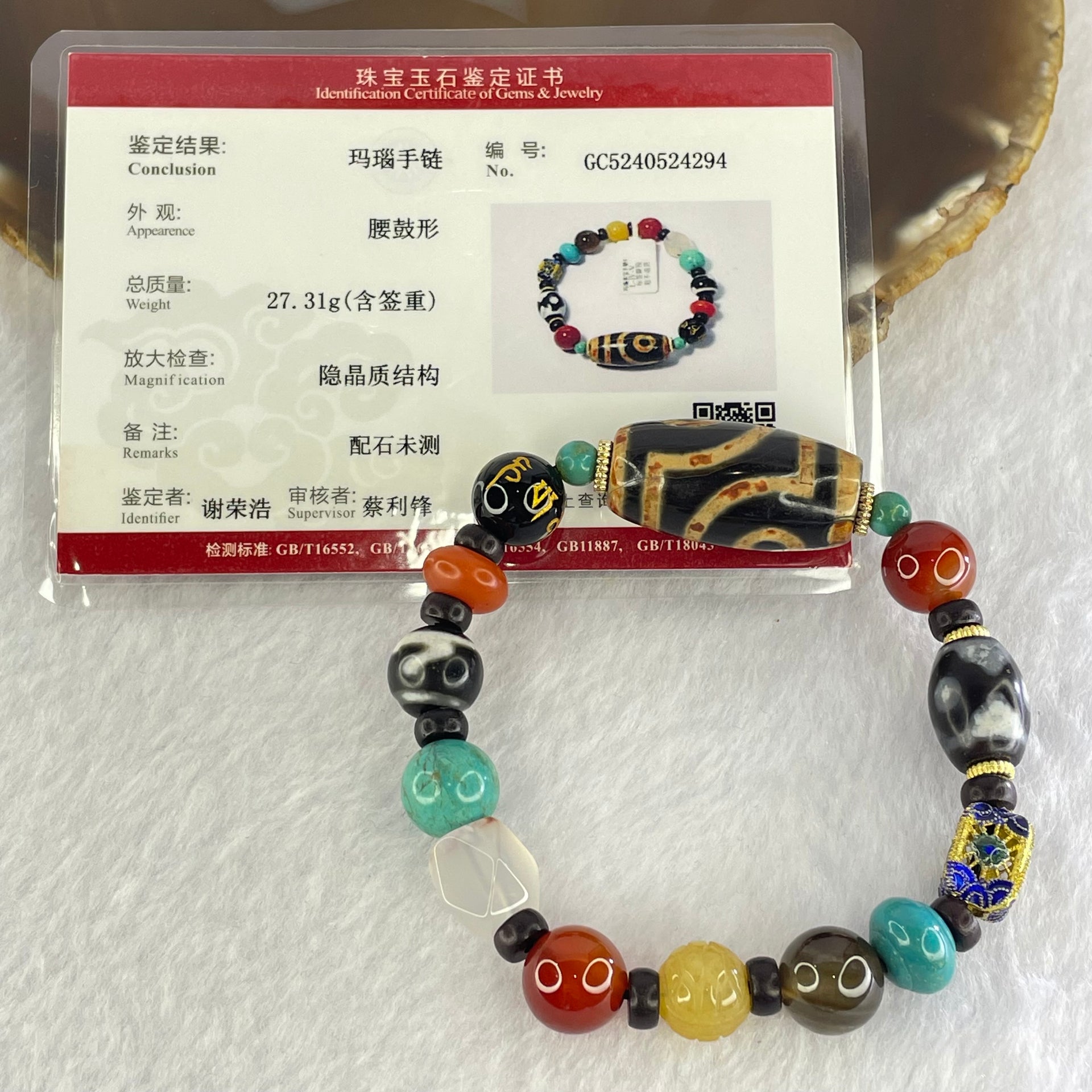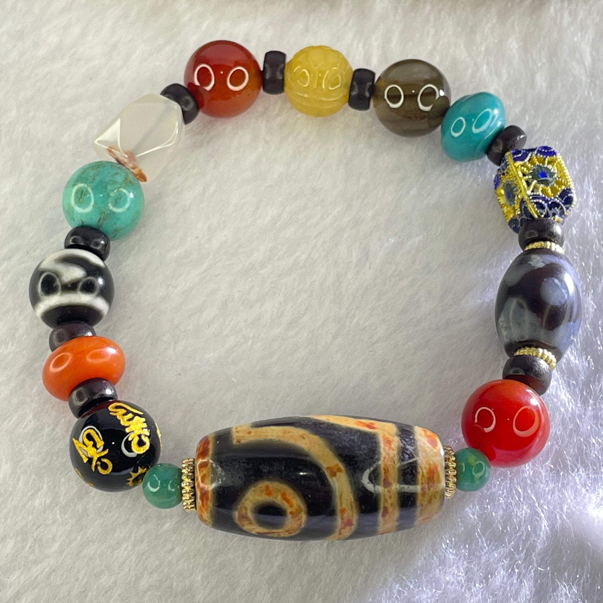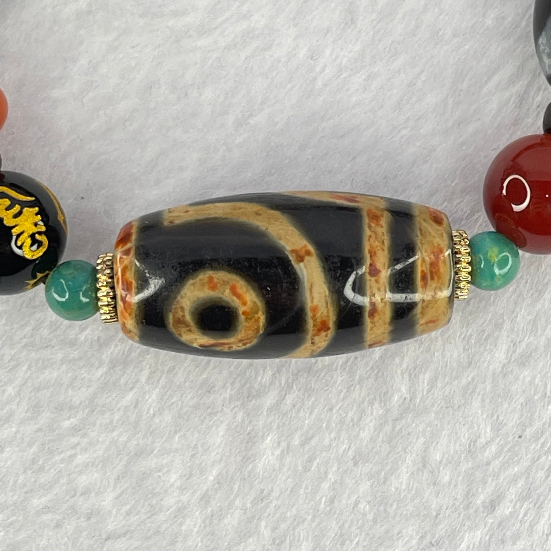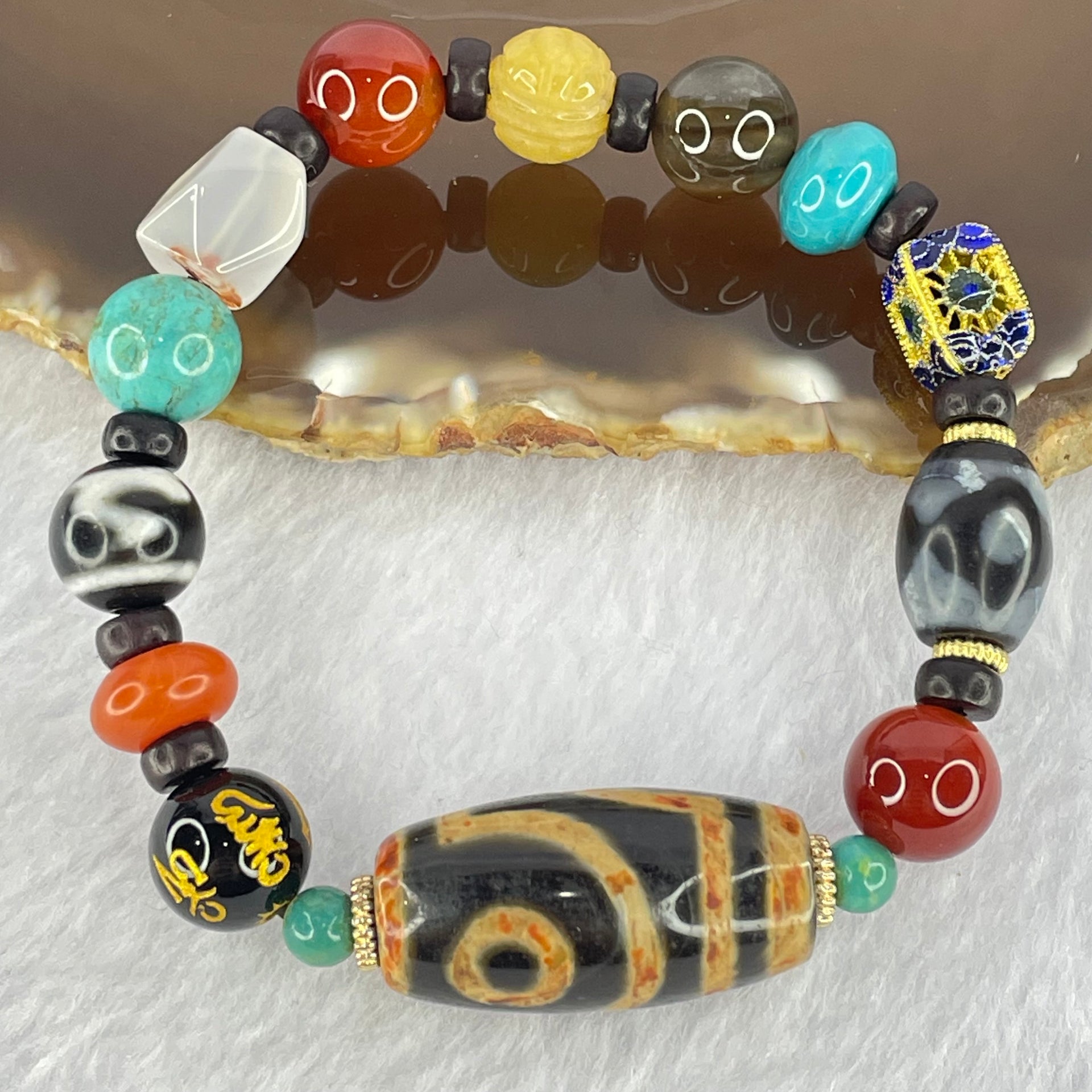 Blessed Certified Muti Treasure with with Tibetan Old Oily Agate Dzi Beads Bracelet (2 Eyes, 3 Eyes, Ruyi Dzi Beads) 27.31g 16cm 28.2 by 14.1mm, 13.9 by 10.4mm, 10.1 by 10.2mm