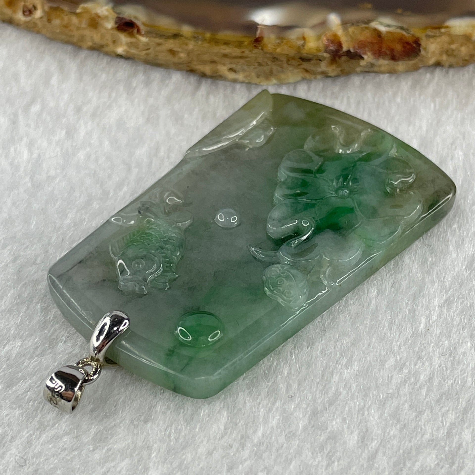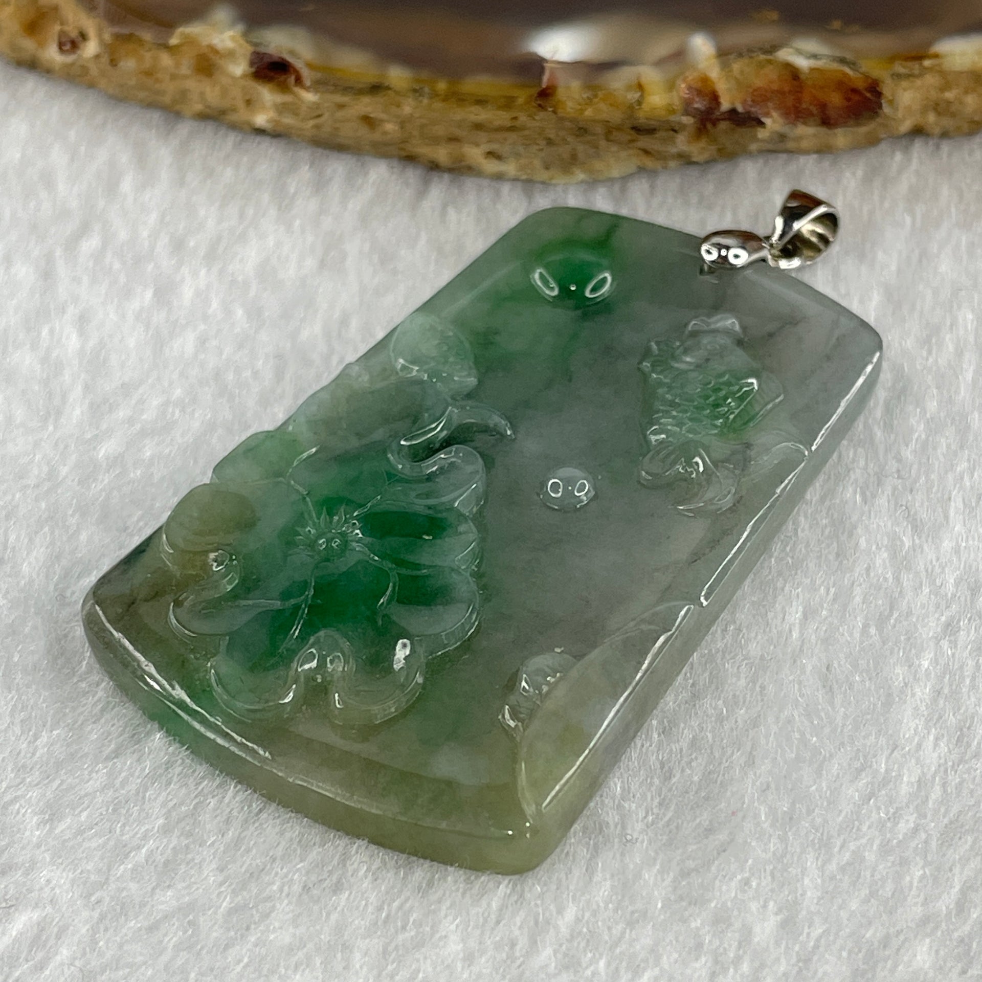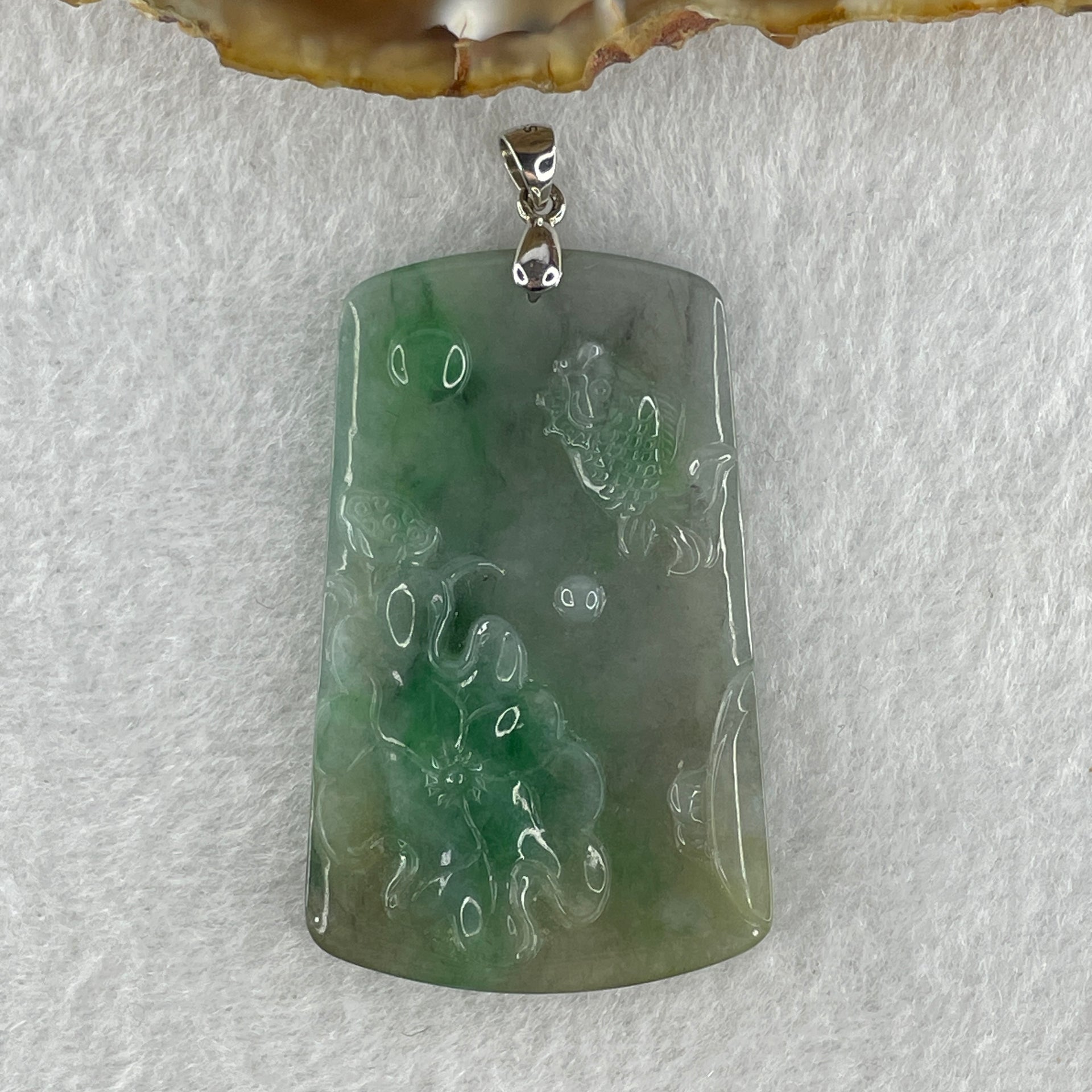 Natural Type A Wuji Grey with High End Bright Green Jadeite Carp Fish with Lotus Flower and Leaf in S925 Silver Pendant 16.45g 48.3 by 30.5 by 5.2mm