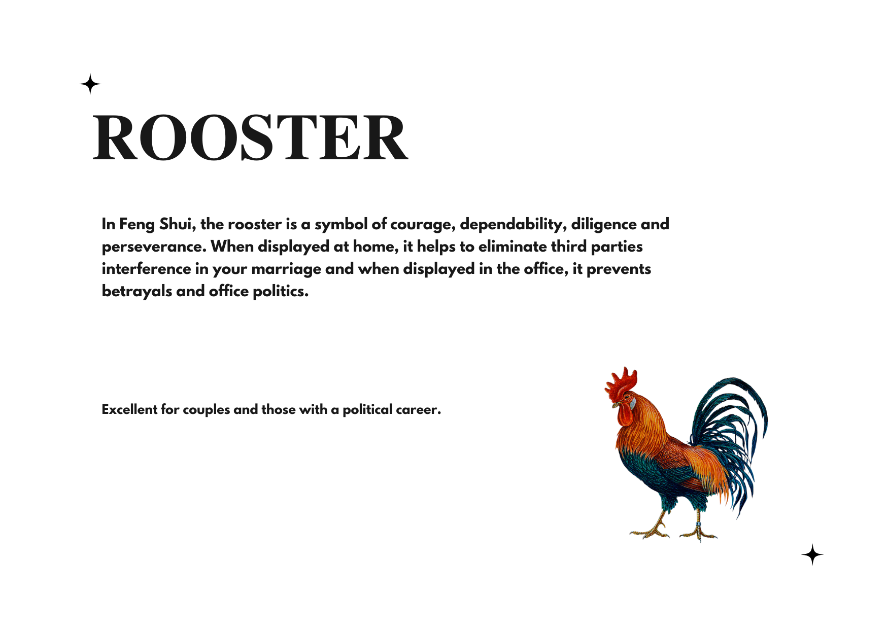 In Feng Shui, the Rooster is a symbol of courage, dependability, diligence & perseverance. When displayed at home it helps to eliminate third parties interference in your marriage and when displayed in the office it prevents betrayals and office politics.