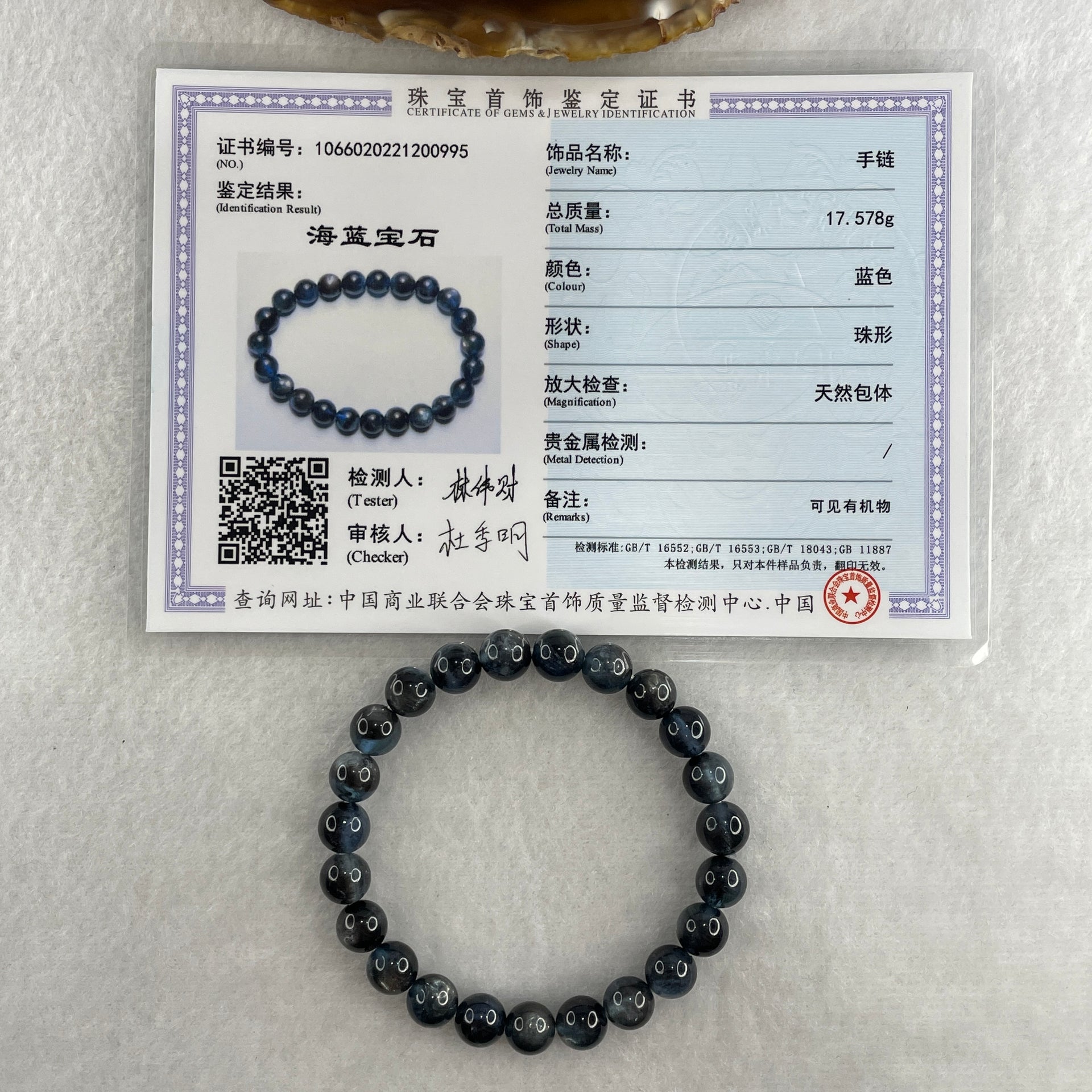Certified Natural Above Average Blue Devil Aquamarine Beads Bracelet 17.578g 15.5cm 8.4mm 23Beads