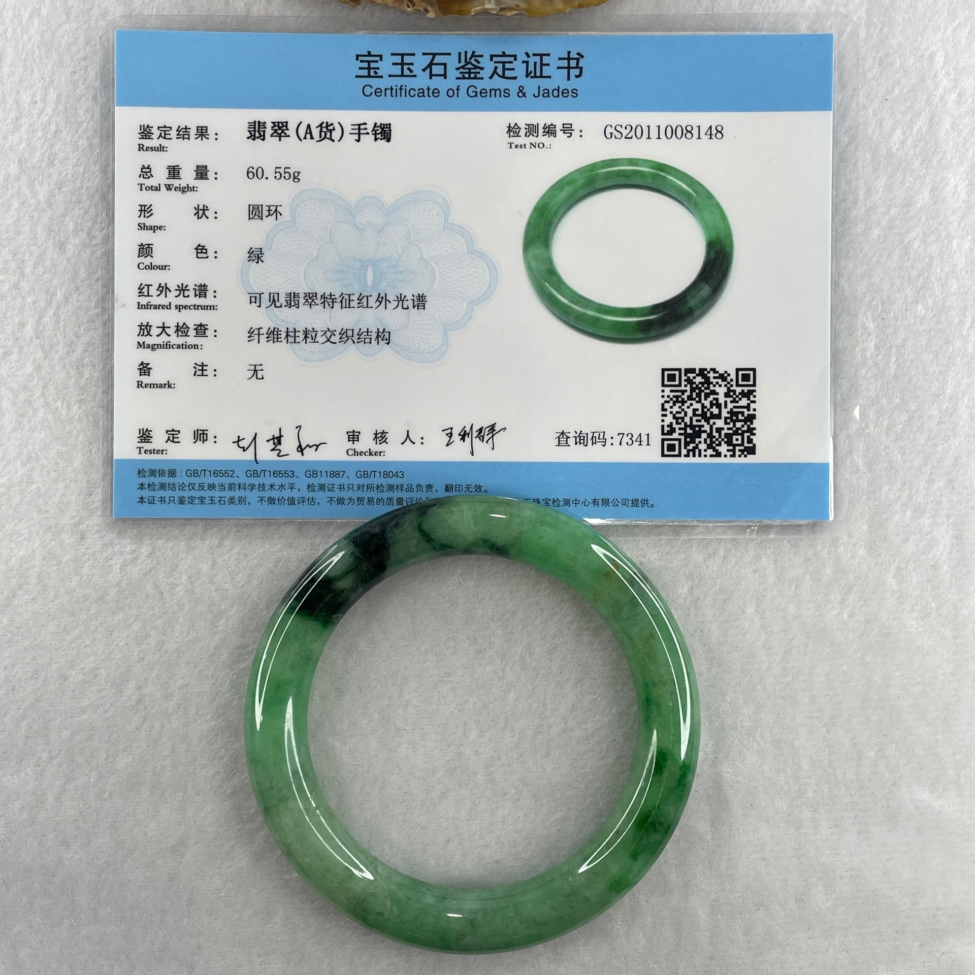 Certified Natural Type A Intense Bright Green with Spicy Green Patches Jadeite Bangle 60.55g Internal Diameter 57.2mm 10.3 by 10.8mm ( Slight External Line)