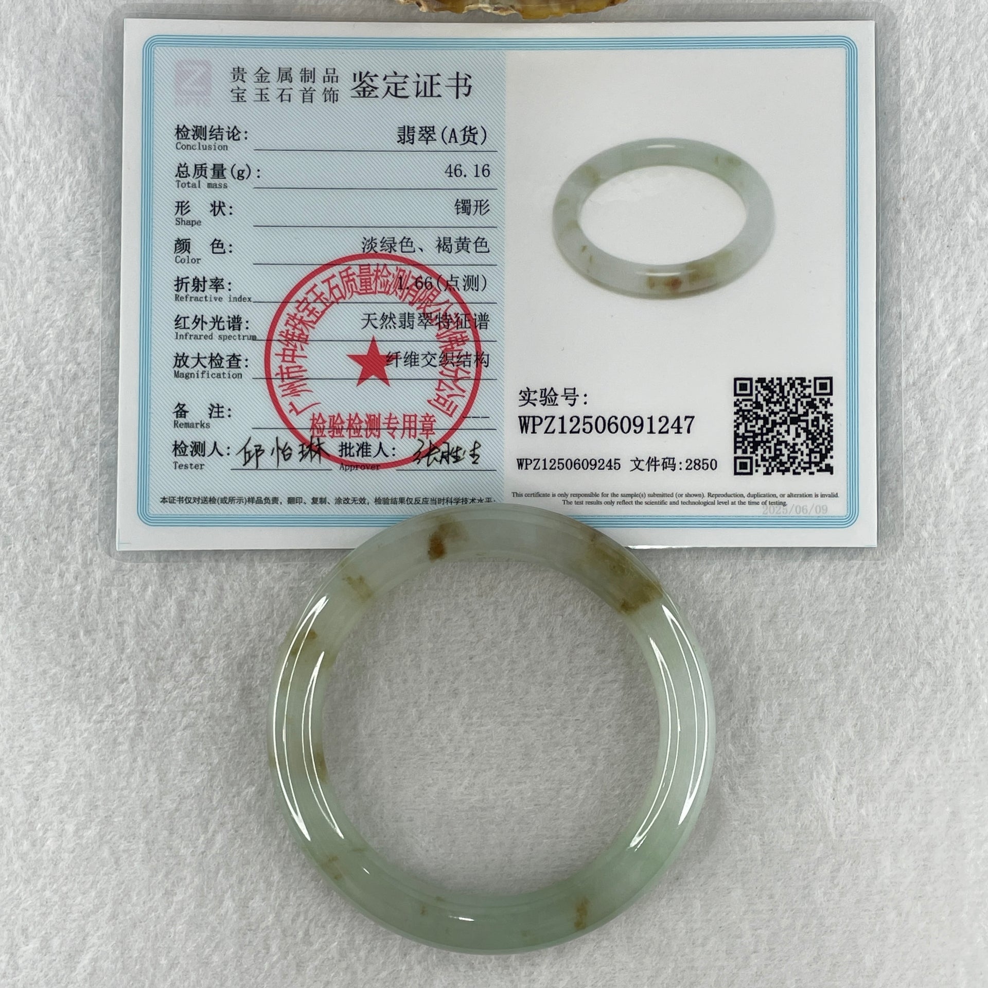 Certified Natural Type A Light Green with Brown Patches Jadeite Bangle 46.16g Inner Diameter 55.9mm Thickness 9.2 by 9.8mm (Close to Perfect)