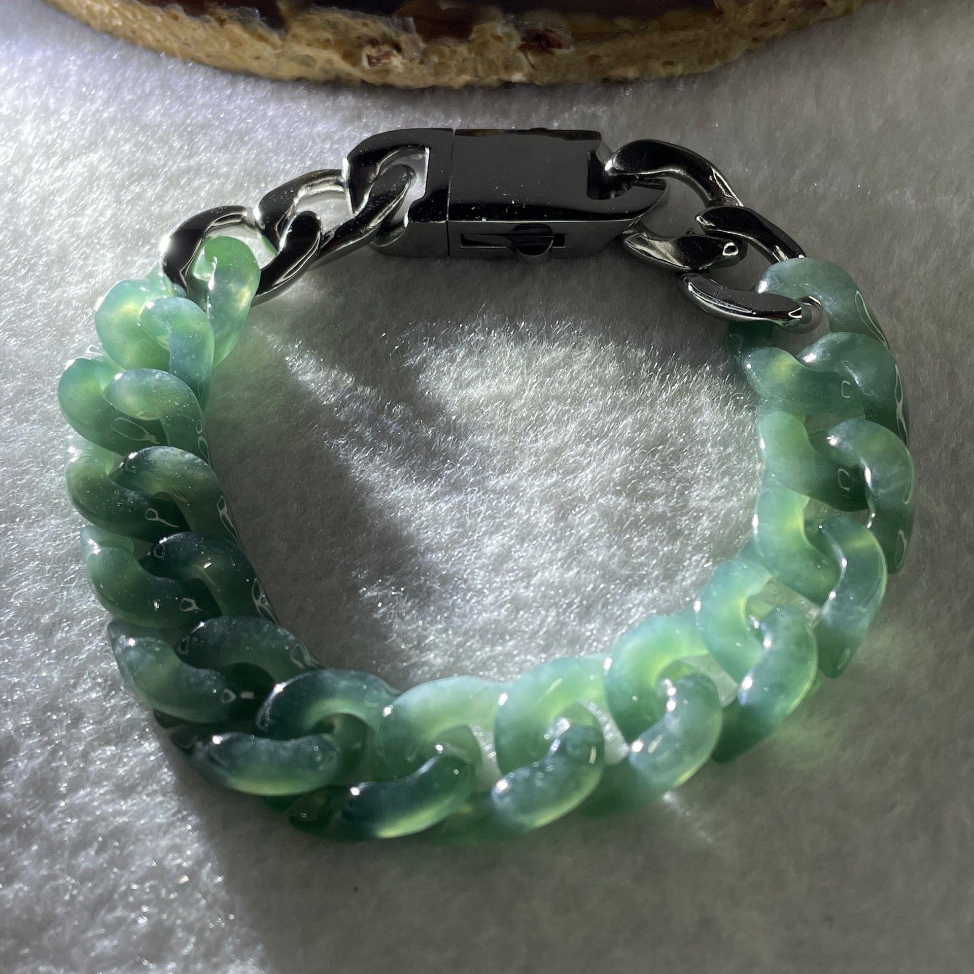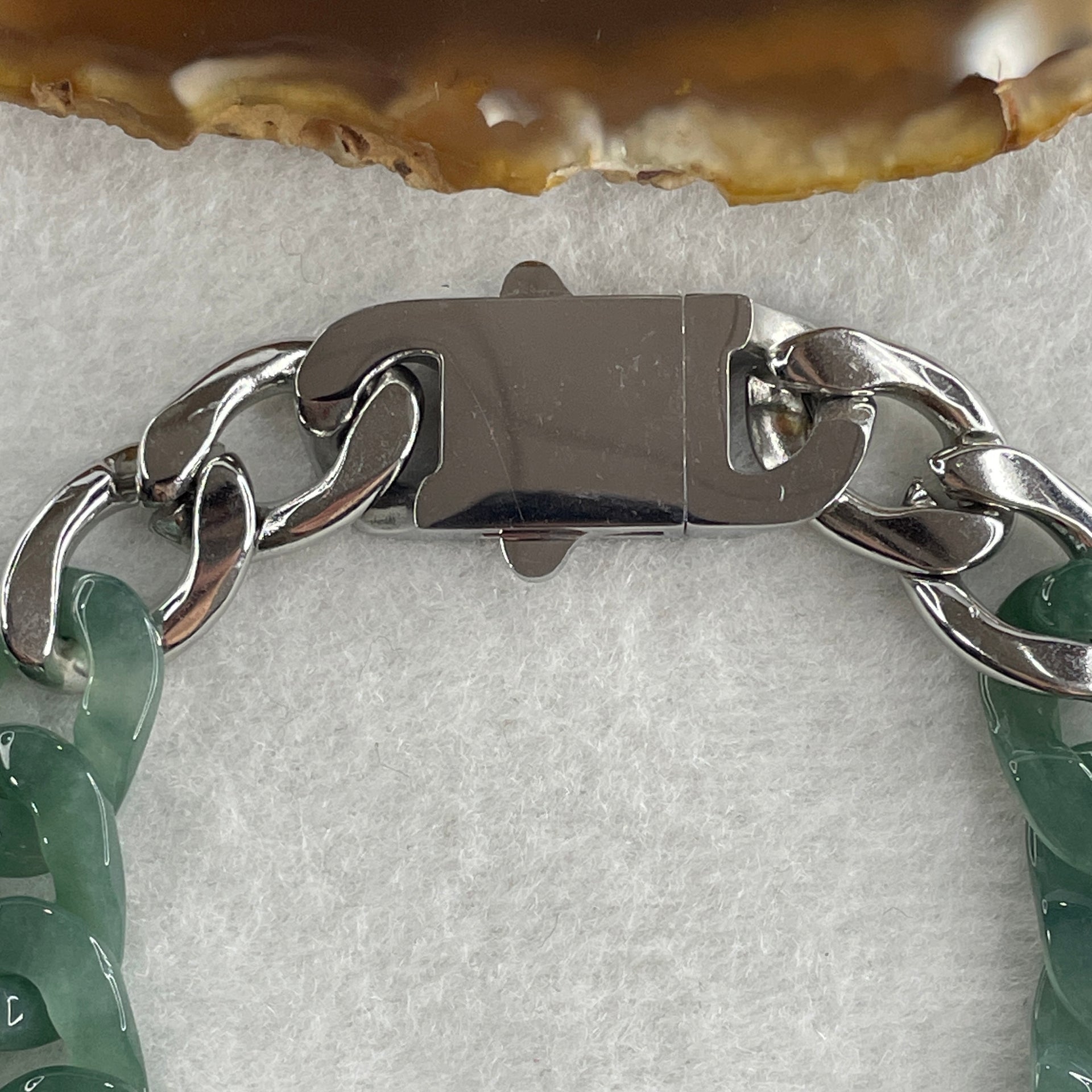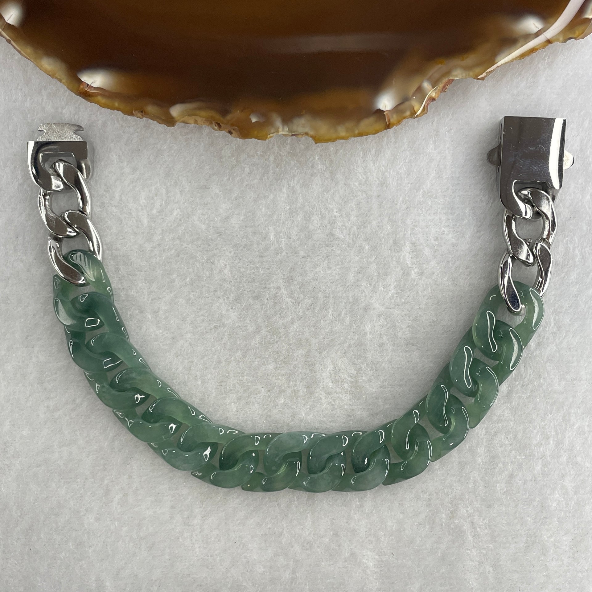 Certified Natural Type A Semi Icy Blueish Green Jadeite Cuban Tennis Bracelet with Metal Clap 30.93g 17.5cm 12.8 by 17.5 by 4.1mm 14 Pcs