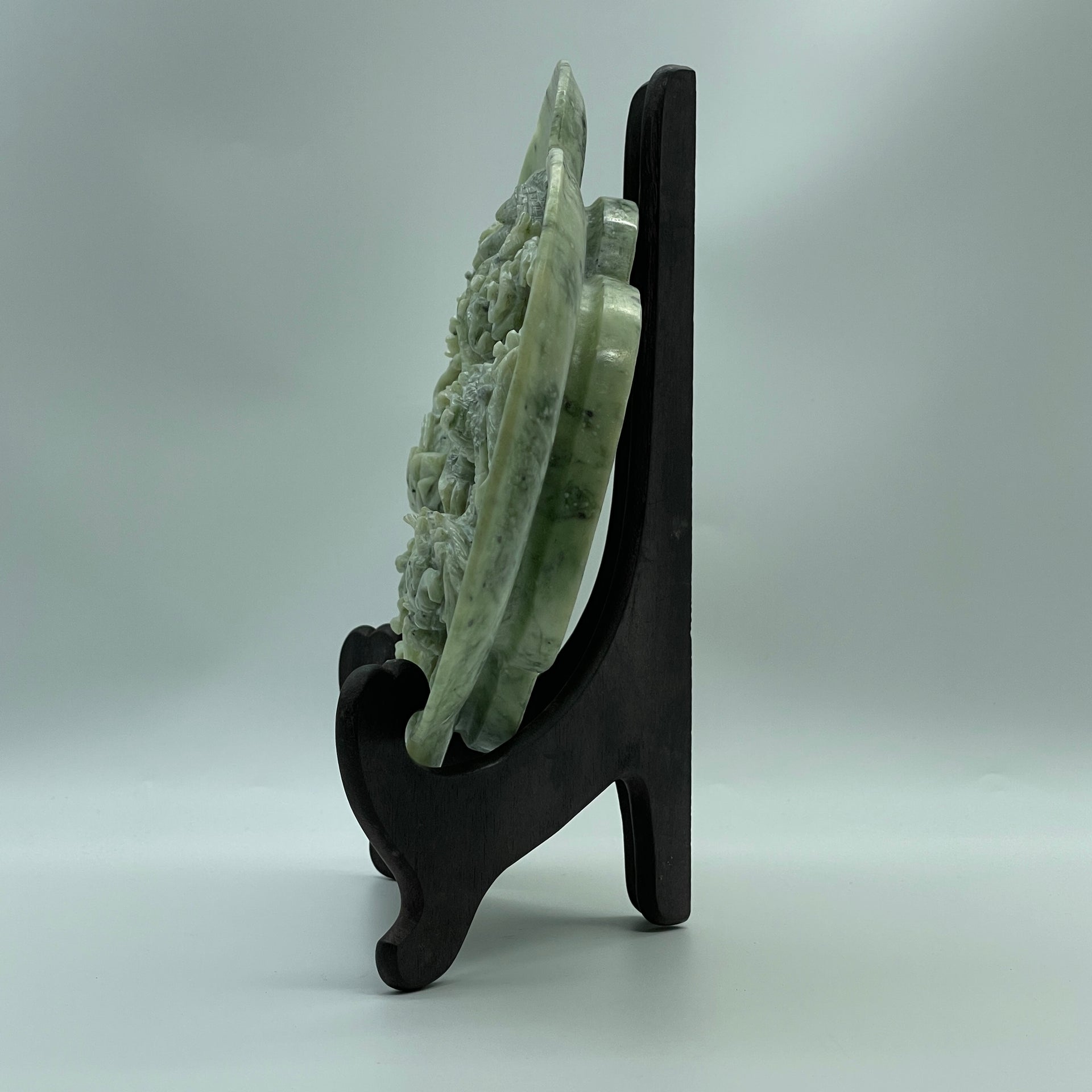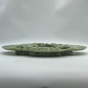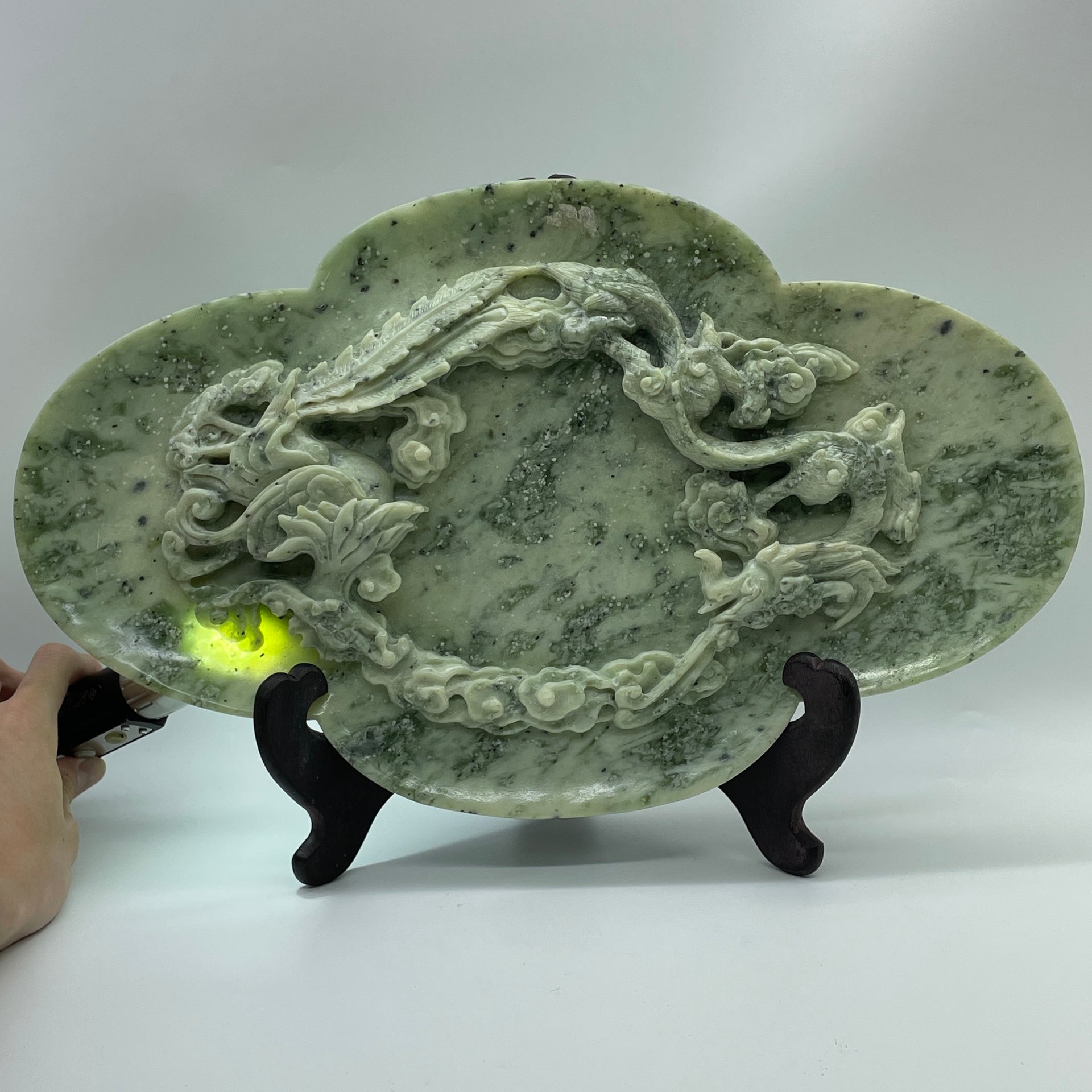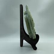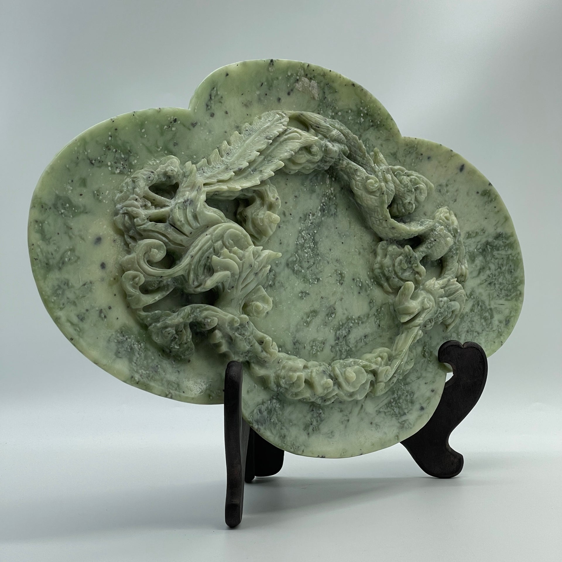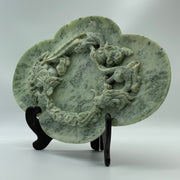 Natural Green with Light Green Serpentine Dragon and Phoenix on Plate with Wooden Stand Display 2,491.7g 394.0 by 108.0 by 254.0mm