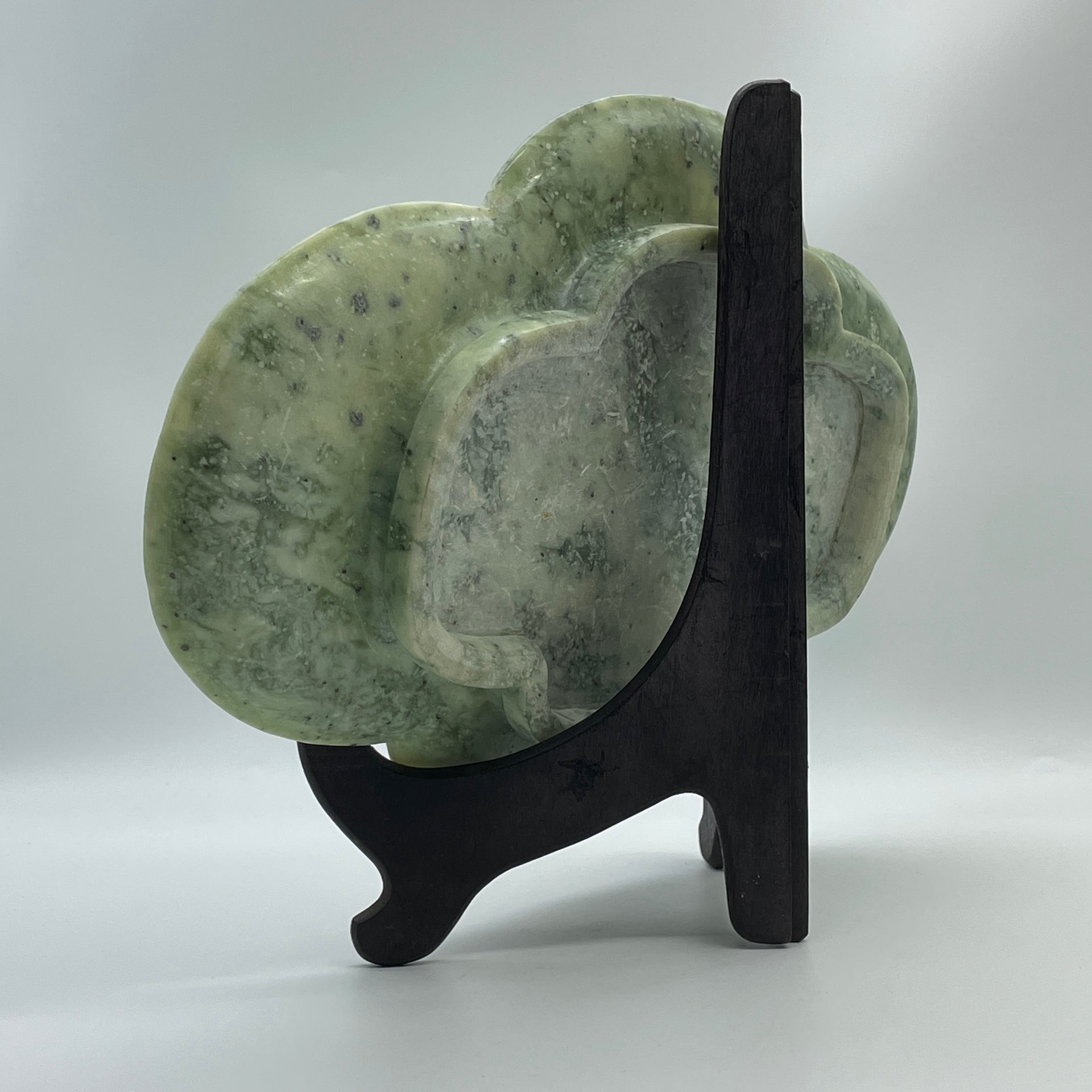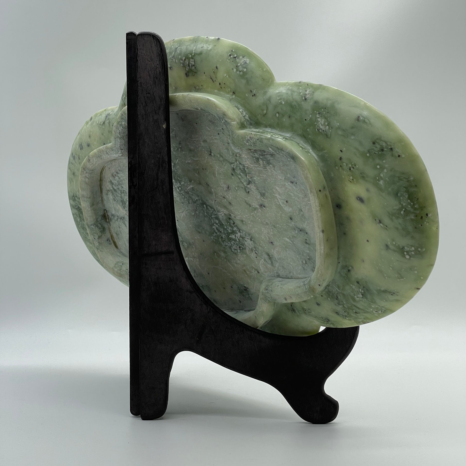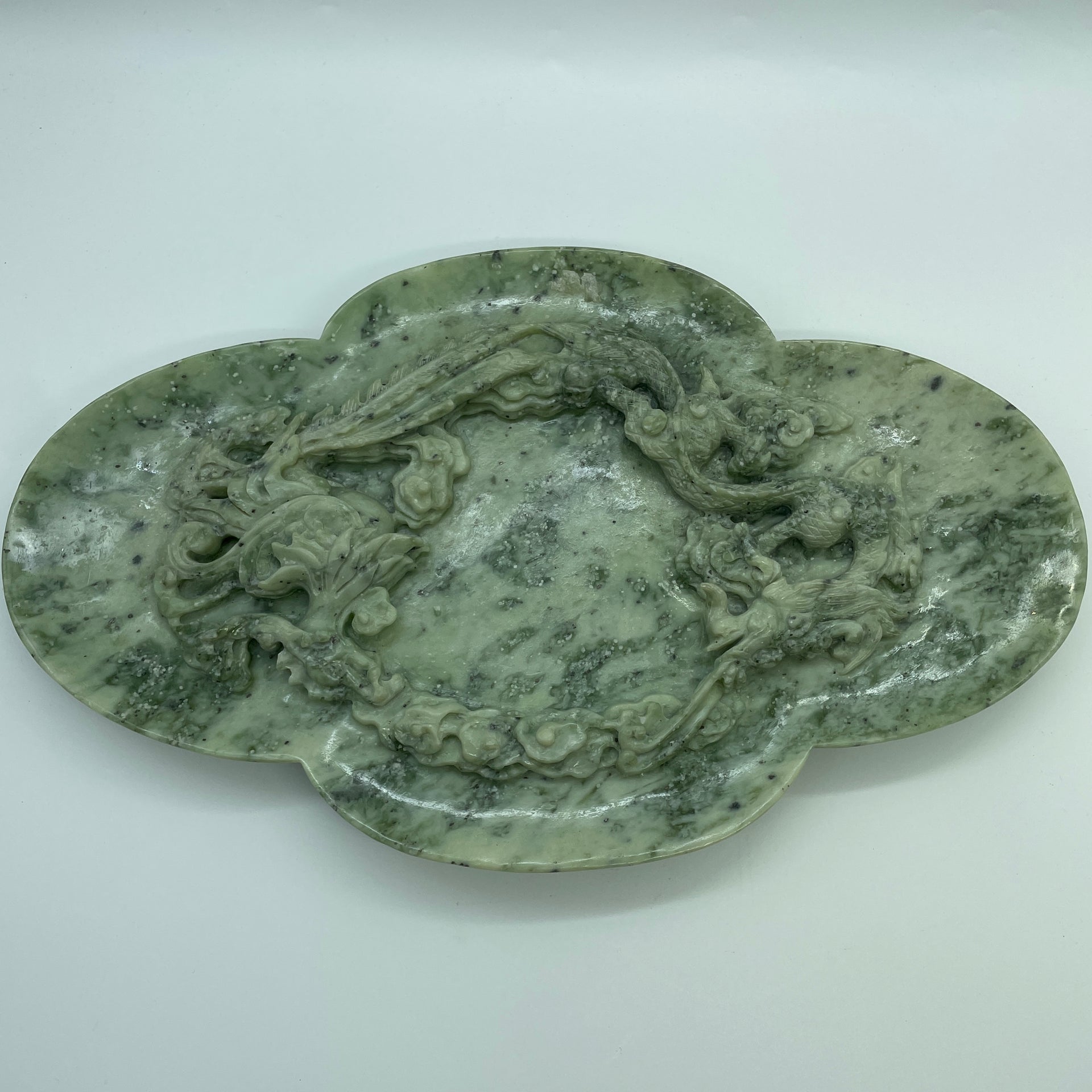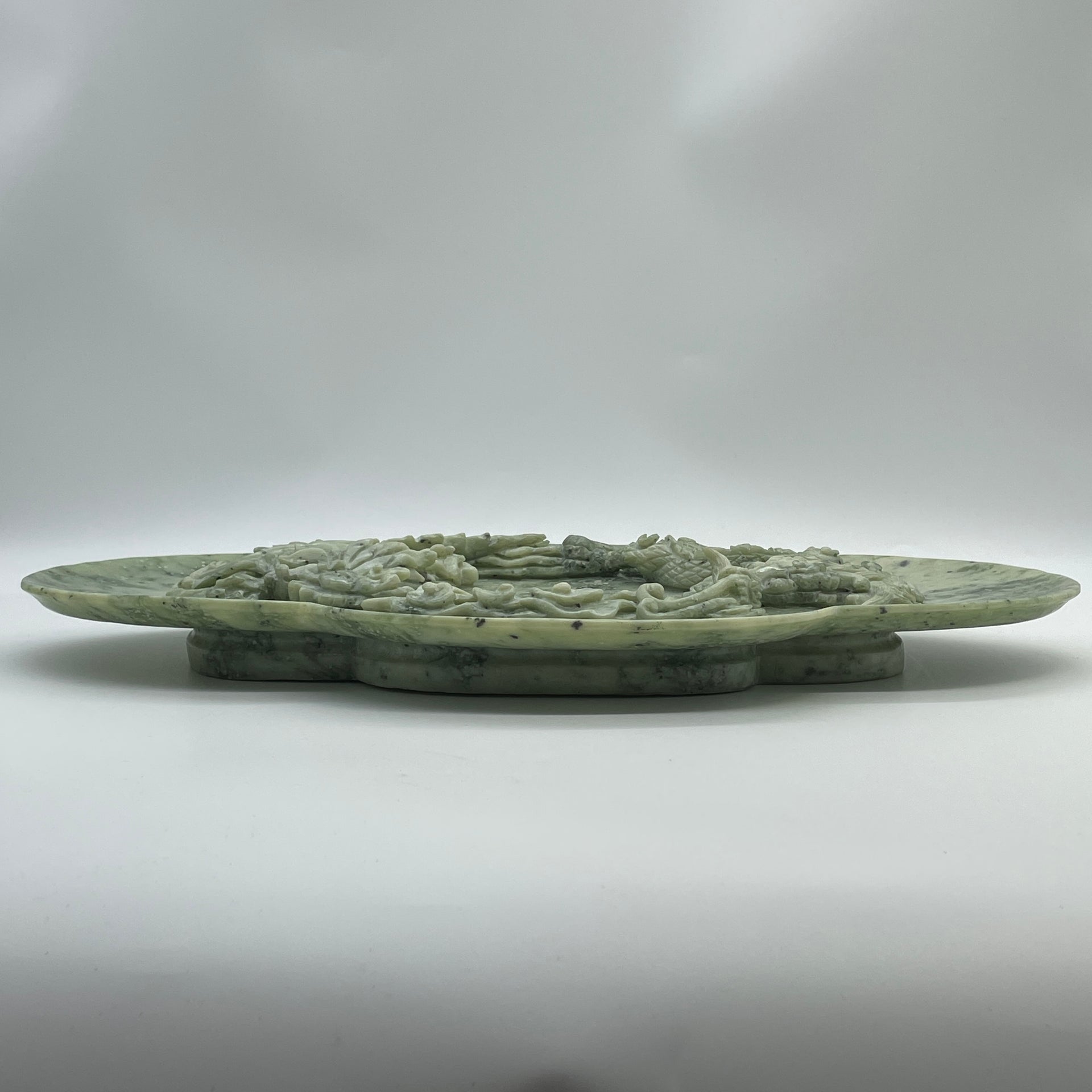 Natural Green with Light Green Serpentine Dragon and Phoenix on Plate with Wooden Stand Display 2,491.7g 394.0 by 108.0 by 254.0mm