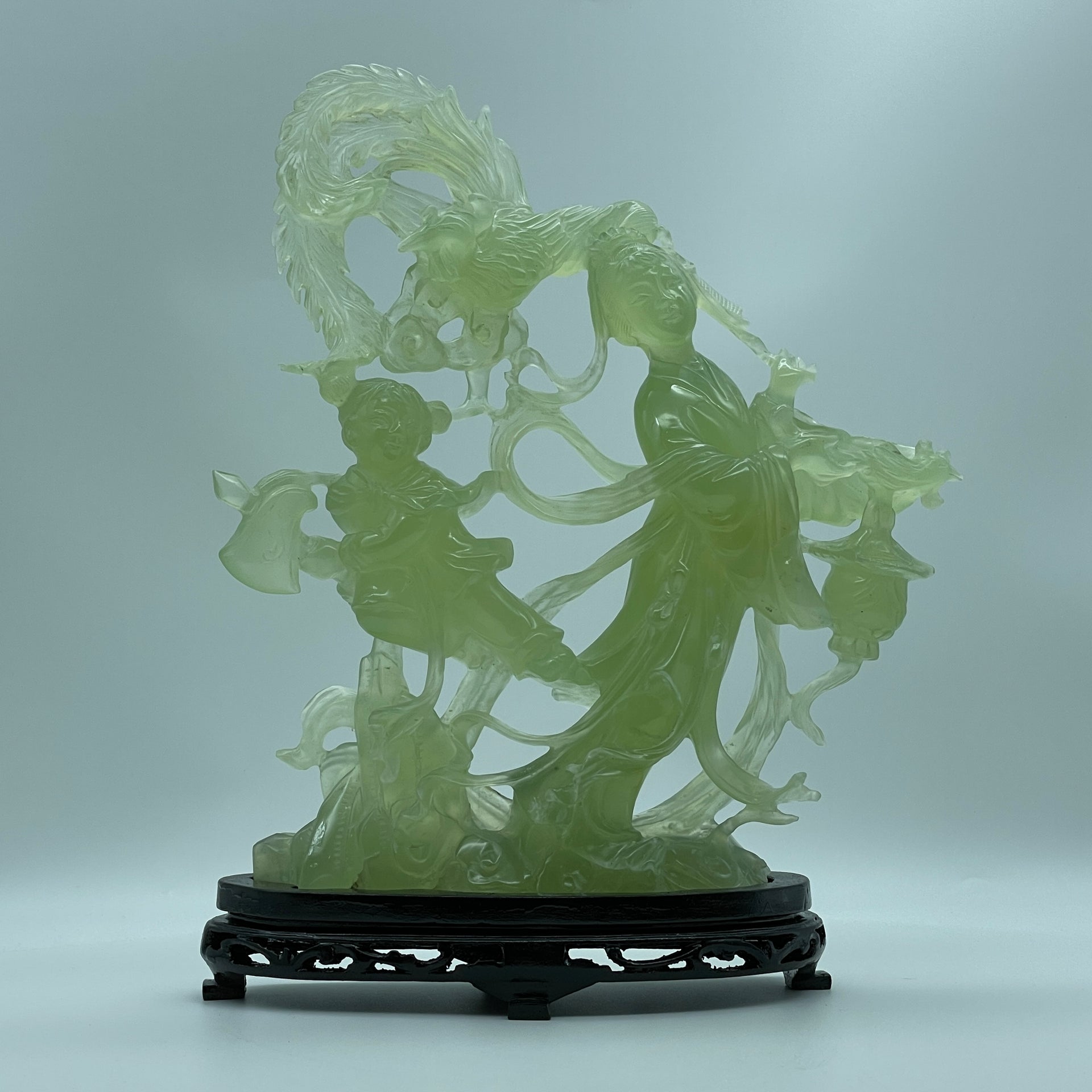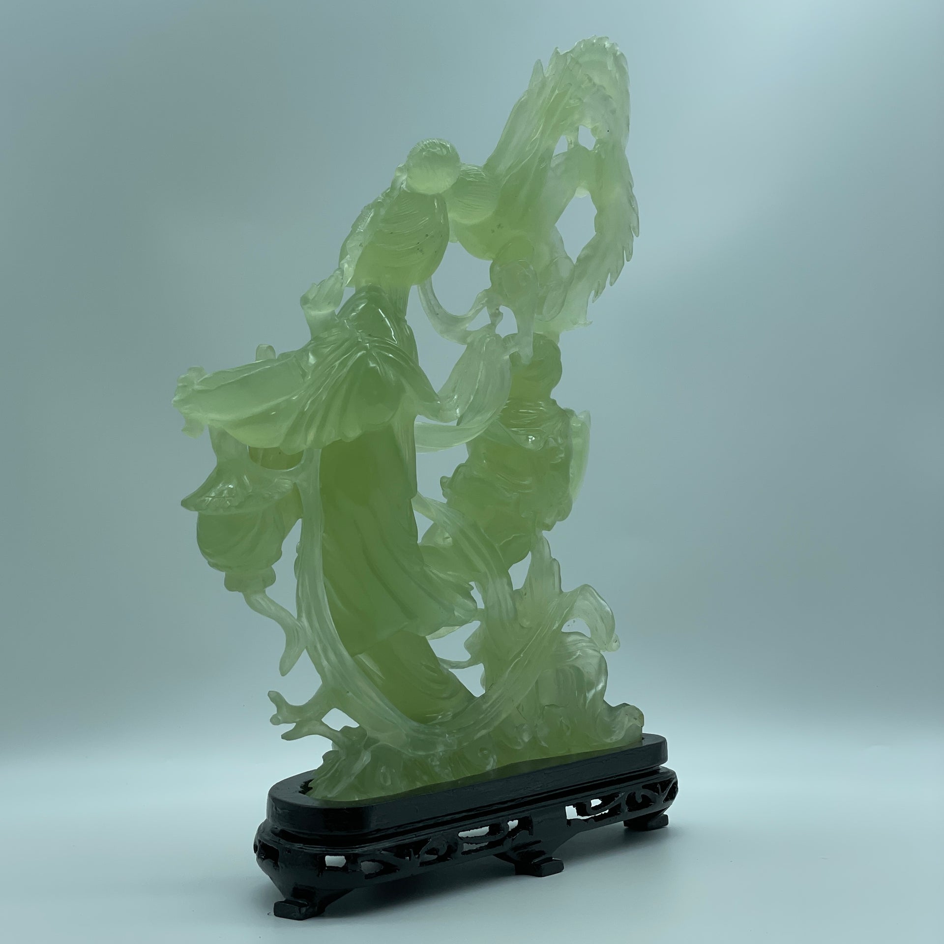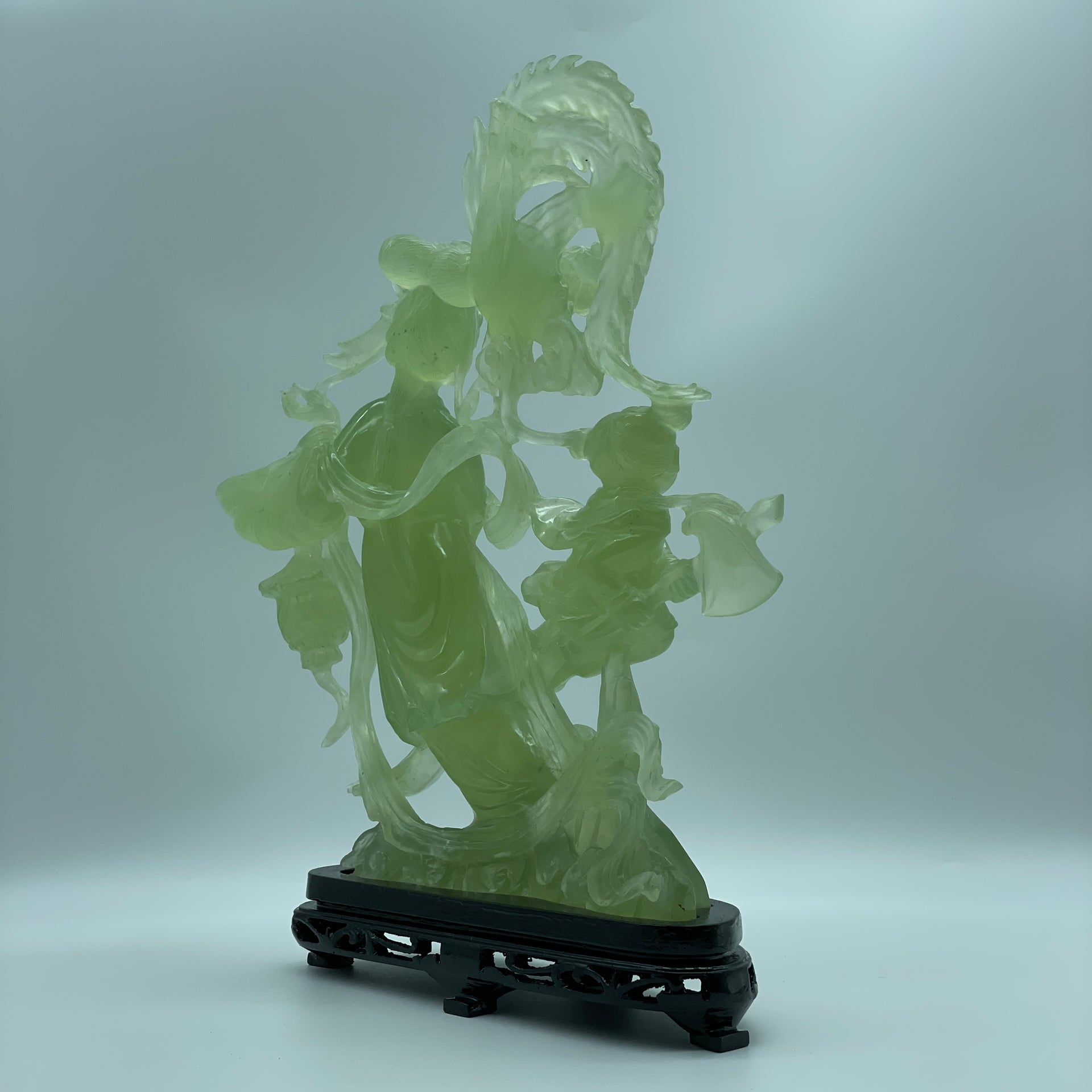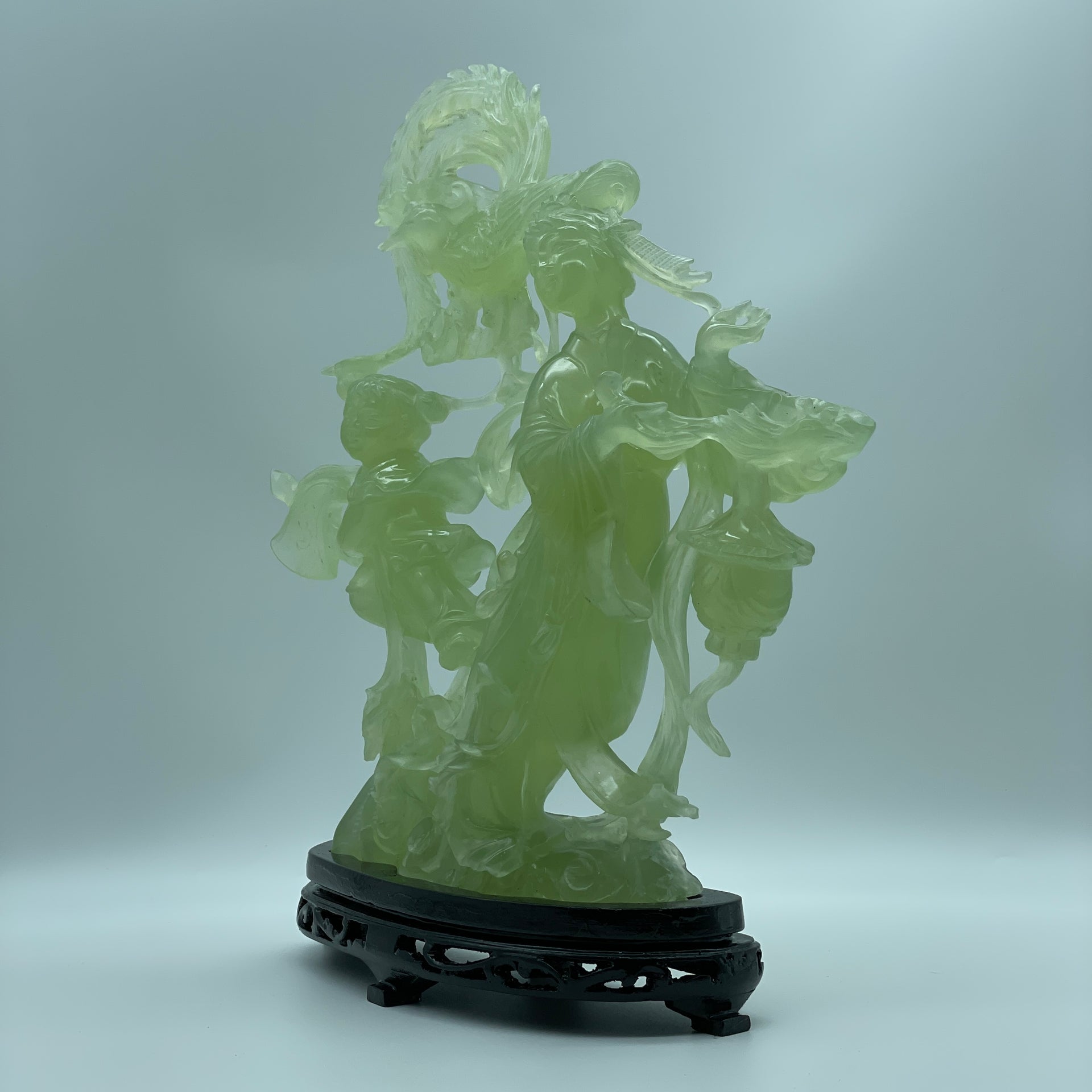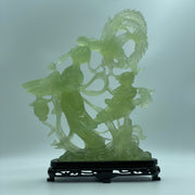 Natural Semi Icy Green Serpentine Fairy with Ne Zha and Phoenix with Wooden Stand Display 1,607.0g 248.0 by 80.0 by 198.0mm