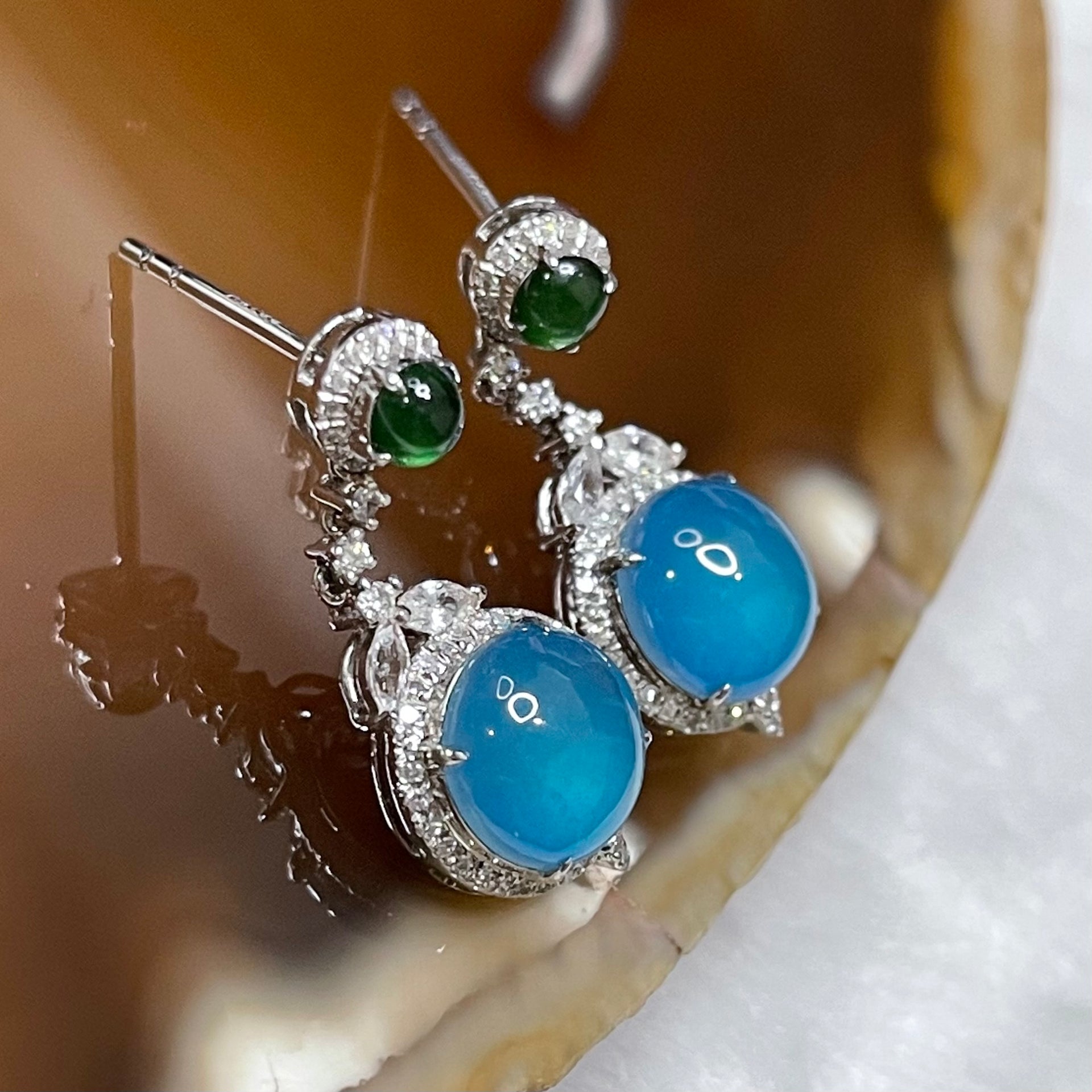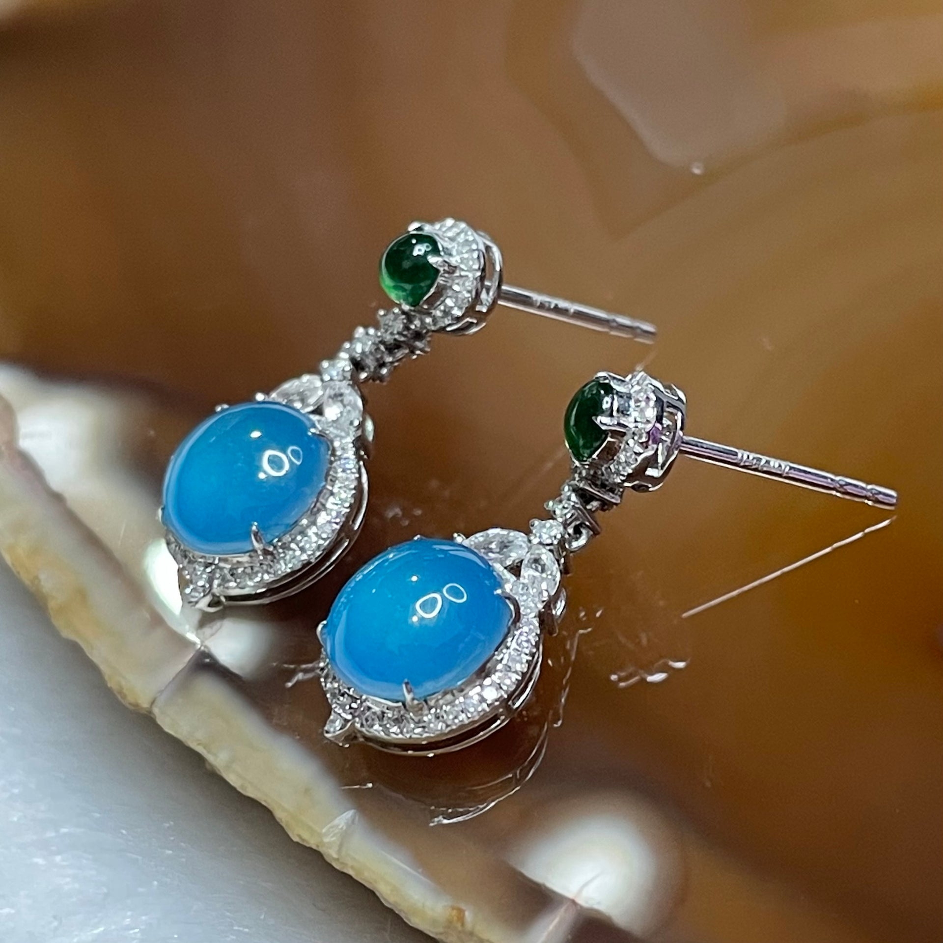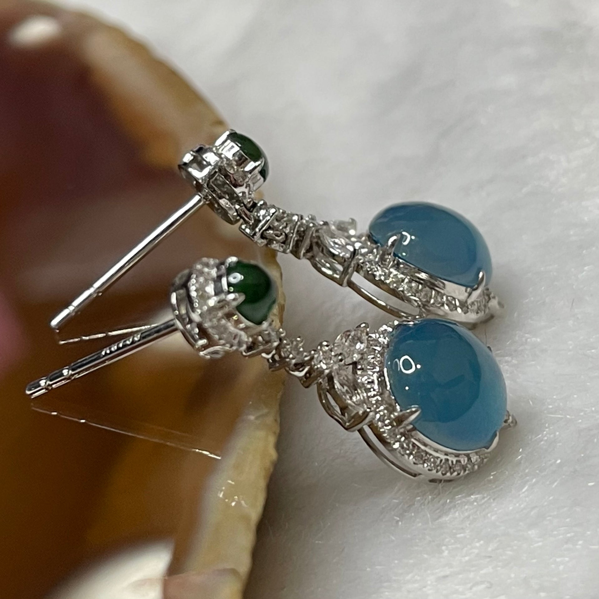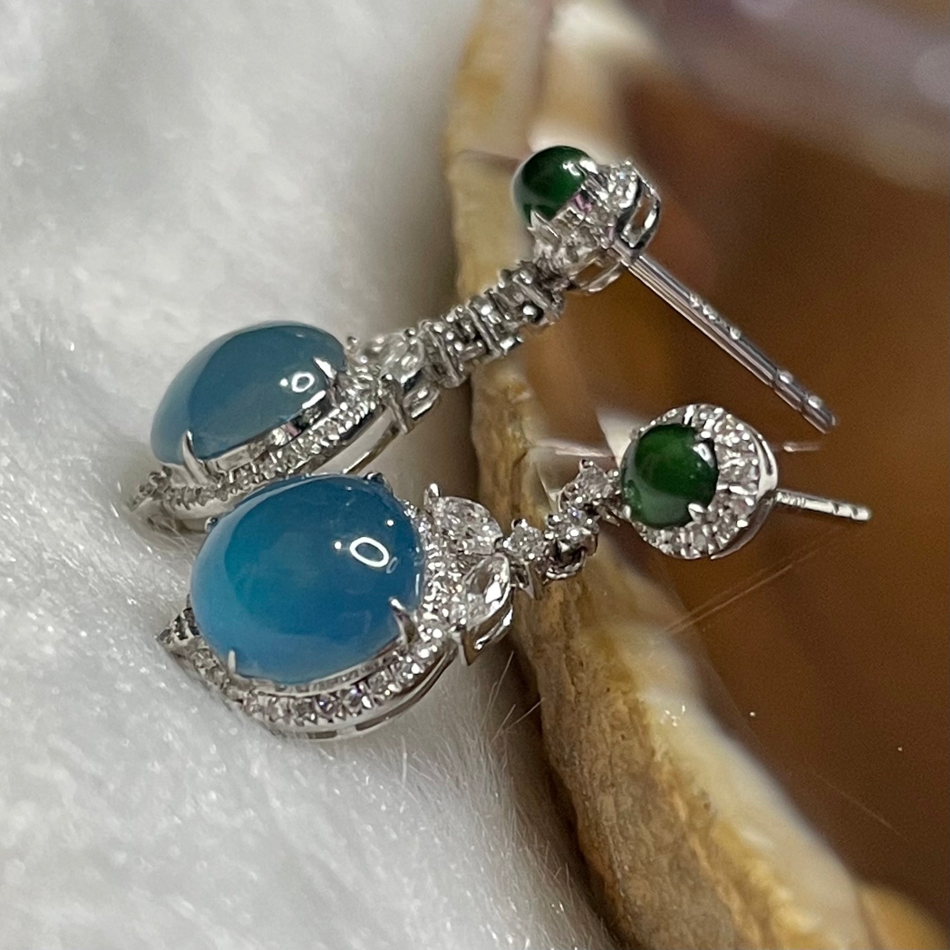 RARE Type A Blue Jade Jadeite Earring 18k white gold, natural diamonds & white sapphires 2.52g 21.7 by 8.7 by 5.2mm