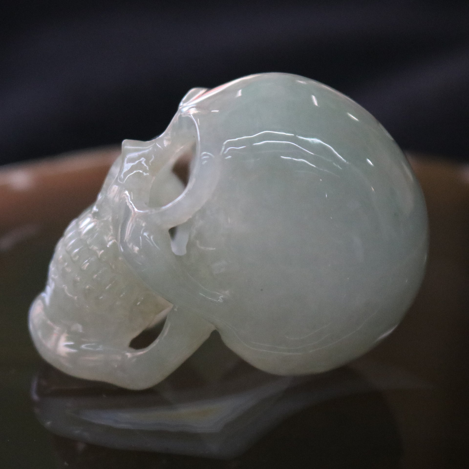 A one of a kind Type A Burmese Jade Jadeite Skull. This piece was specially handcrafted with passion and dedication by a 15 year experience craftsman. It took him around a month to complete. Tradition with an attitude.