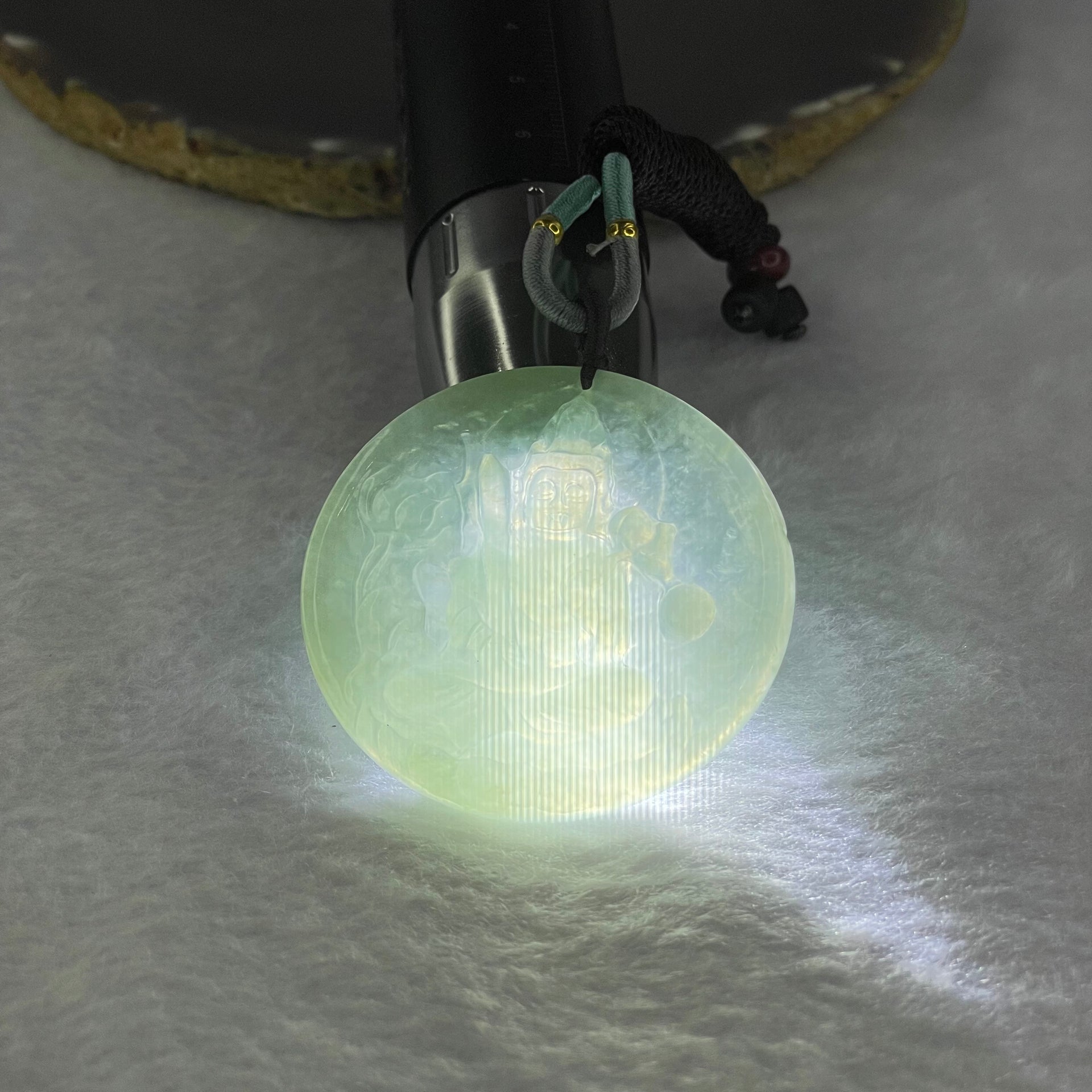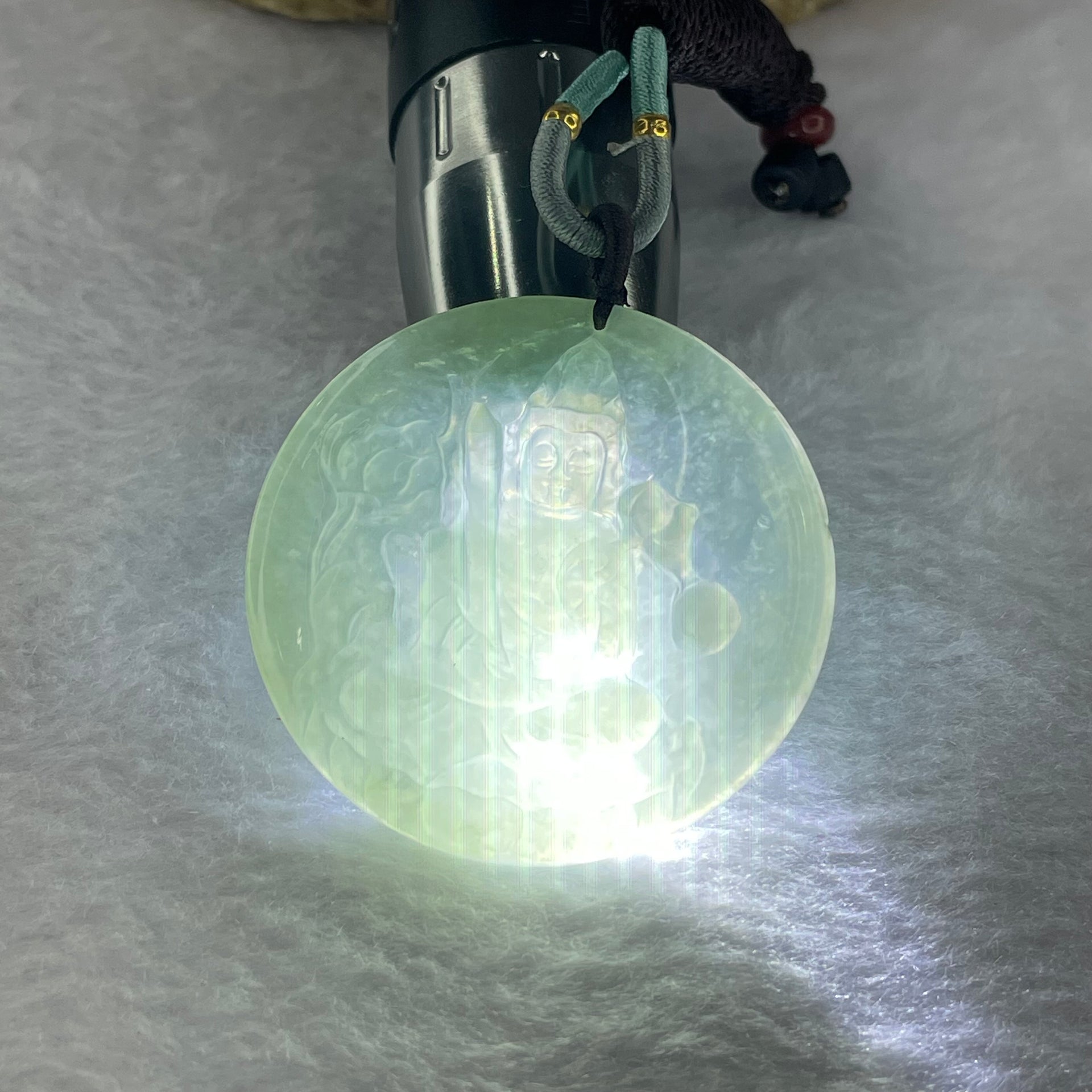 Type A Semi Icy Light Green Jadeite Guan Yin Pendant 24.18g 48.4 by 4.8mm