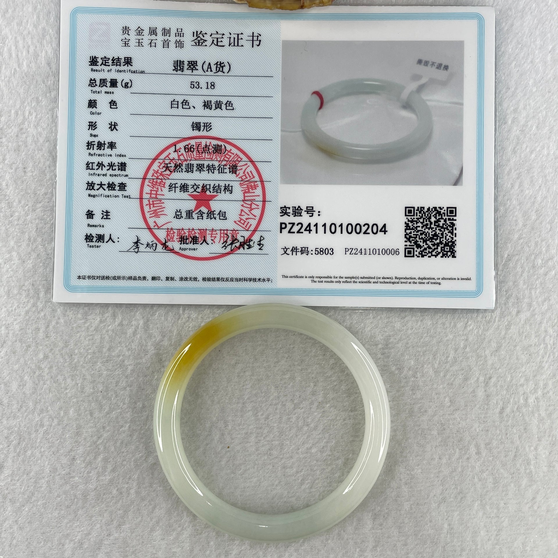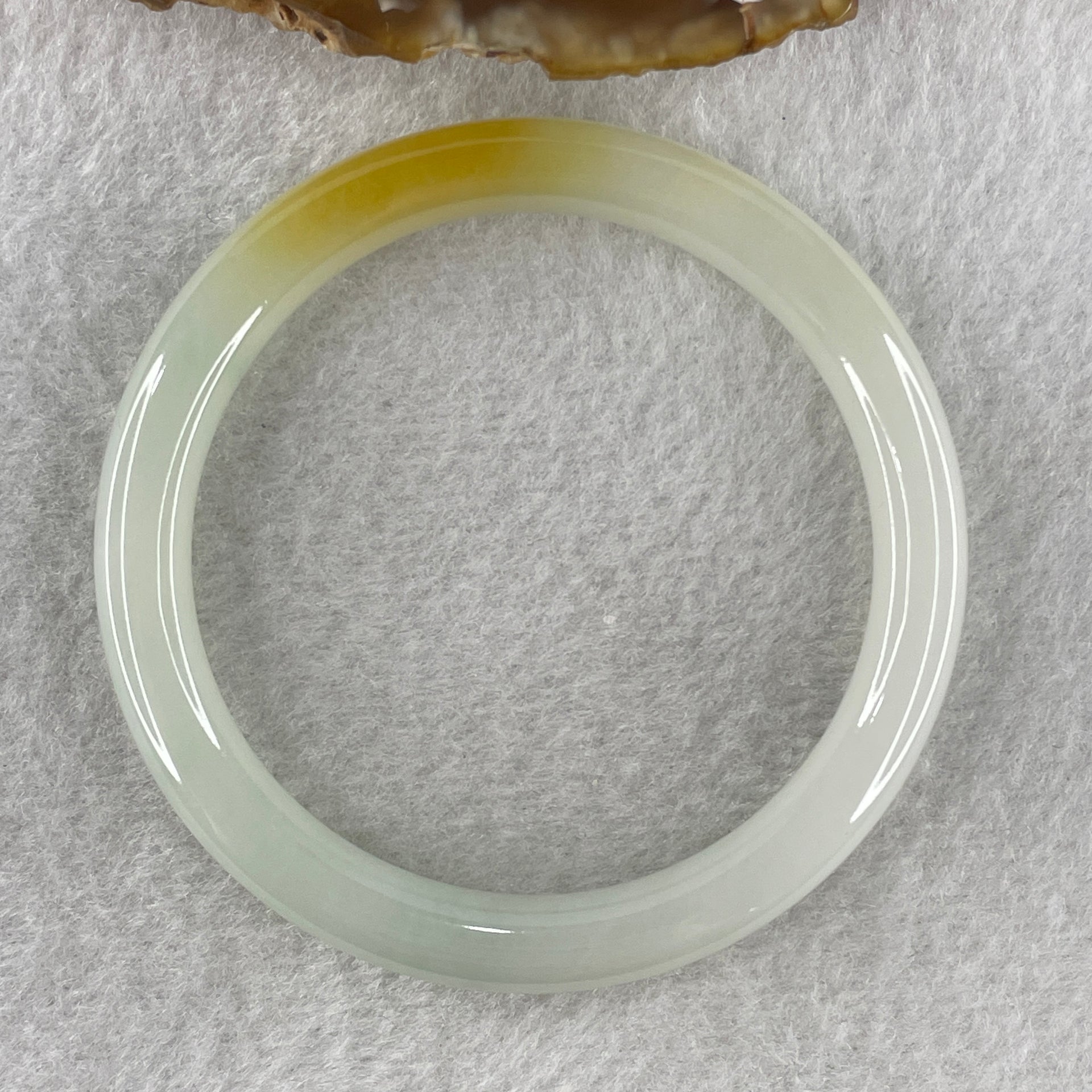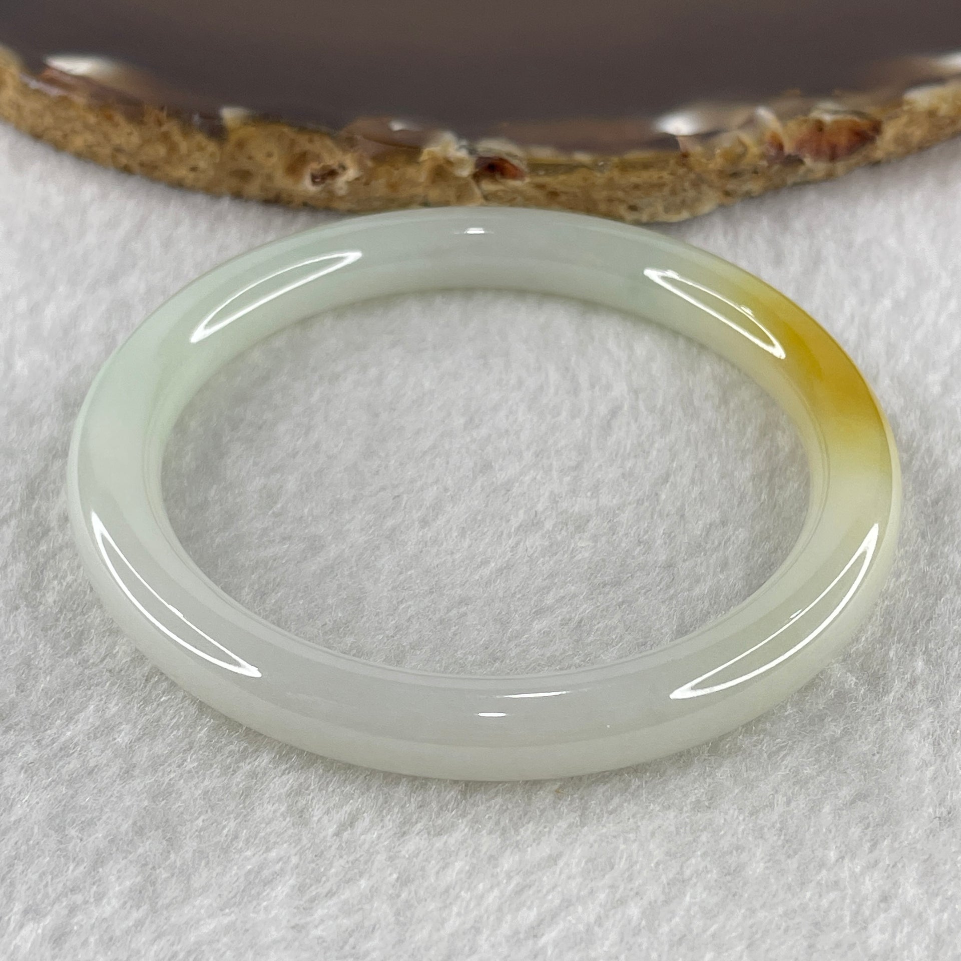 Certified Type A White to Faint Green with Yellowish Spot Jadeite Bangle Internal Diameter 53.1mm 53.18g 7.6 by 7.6m ( Close to Perfect )