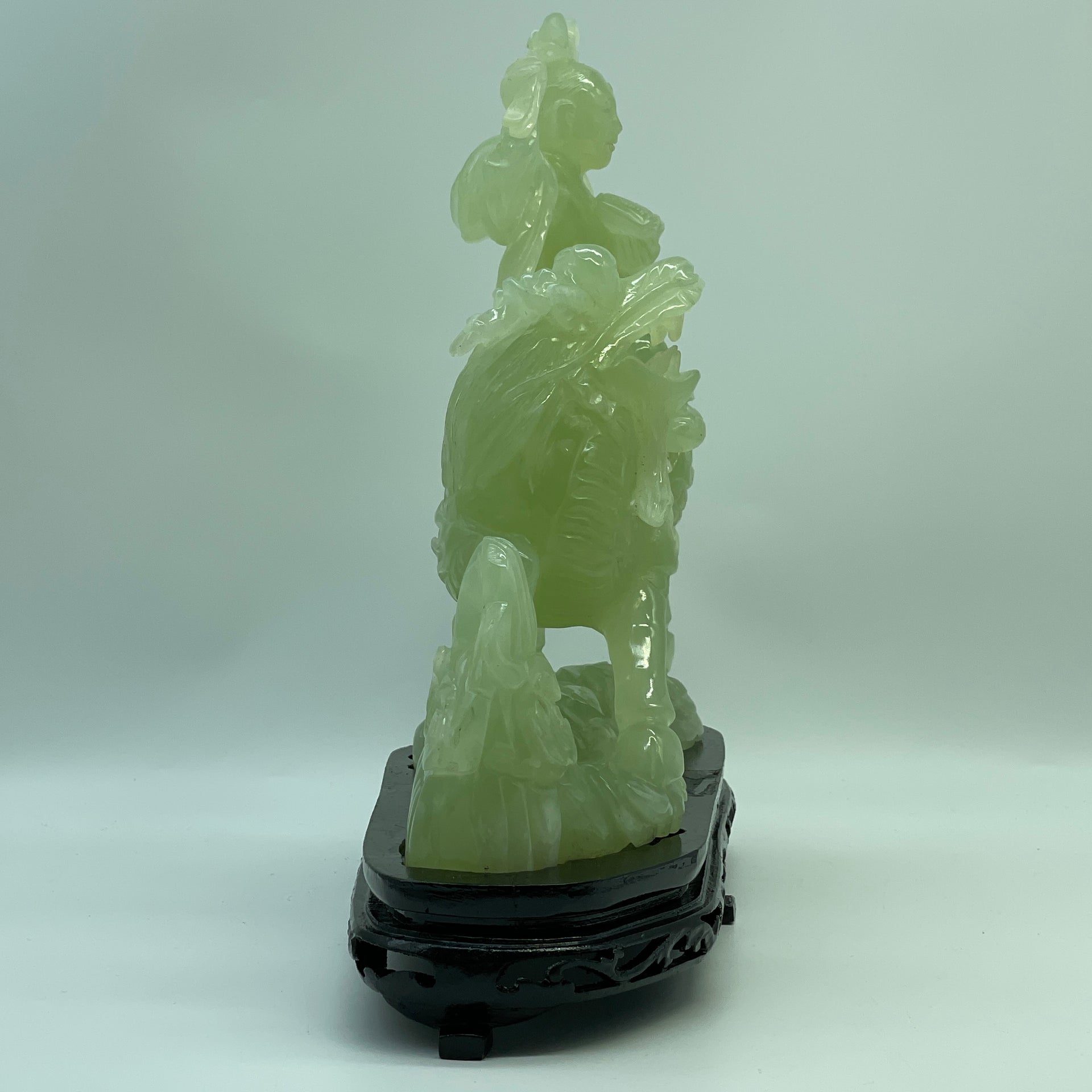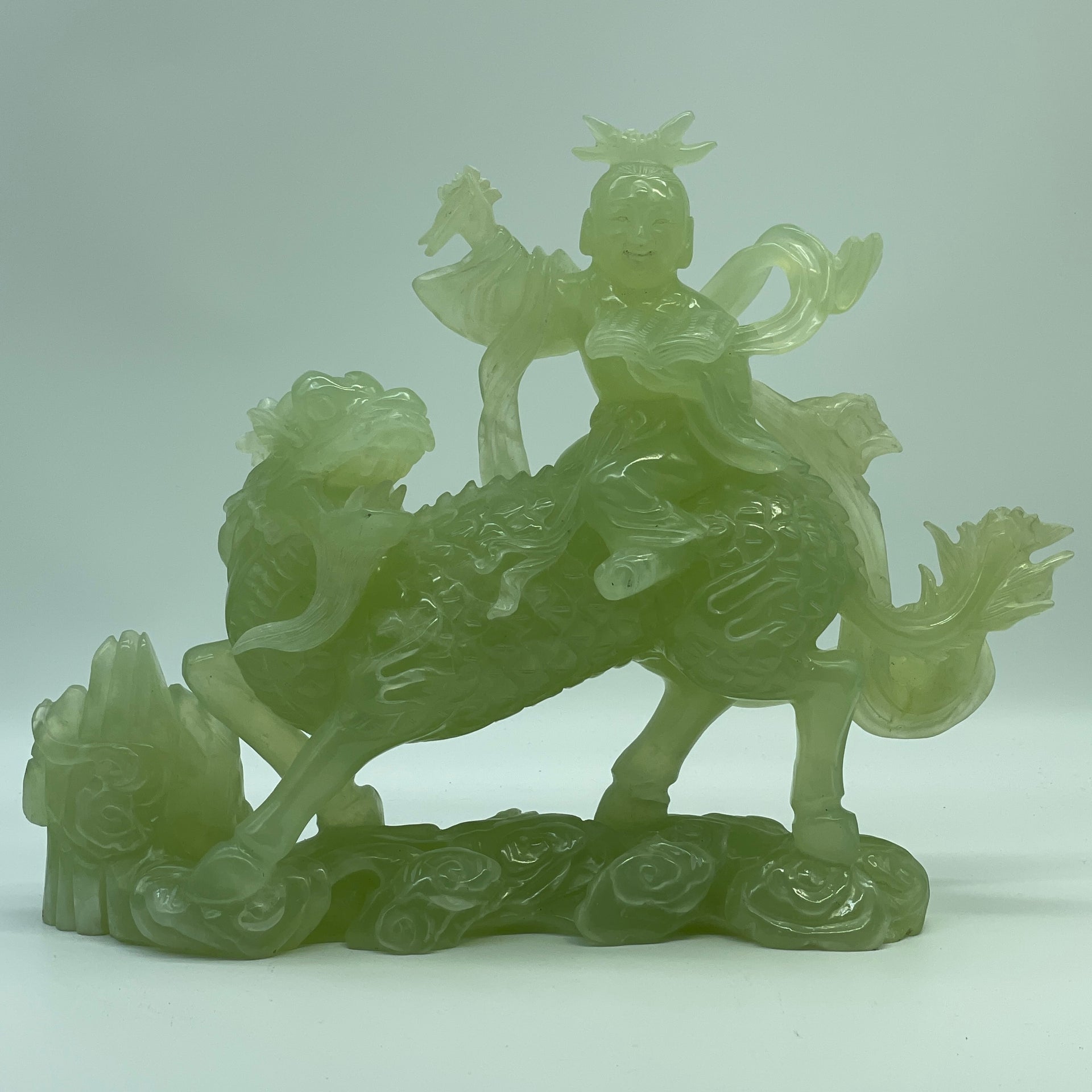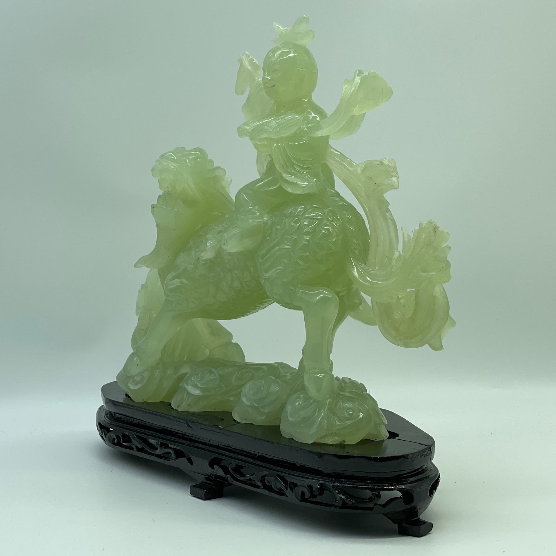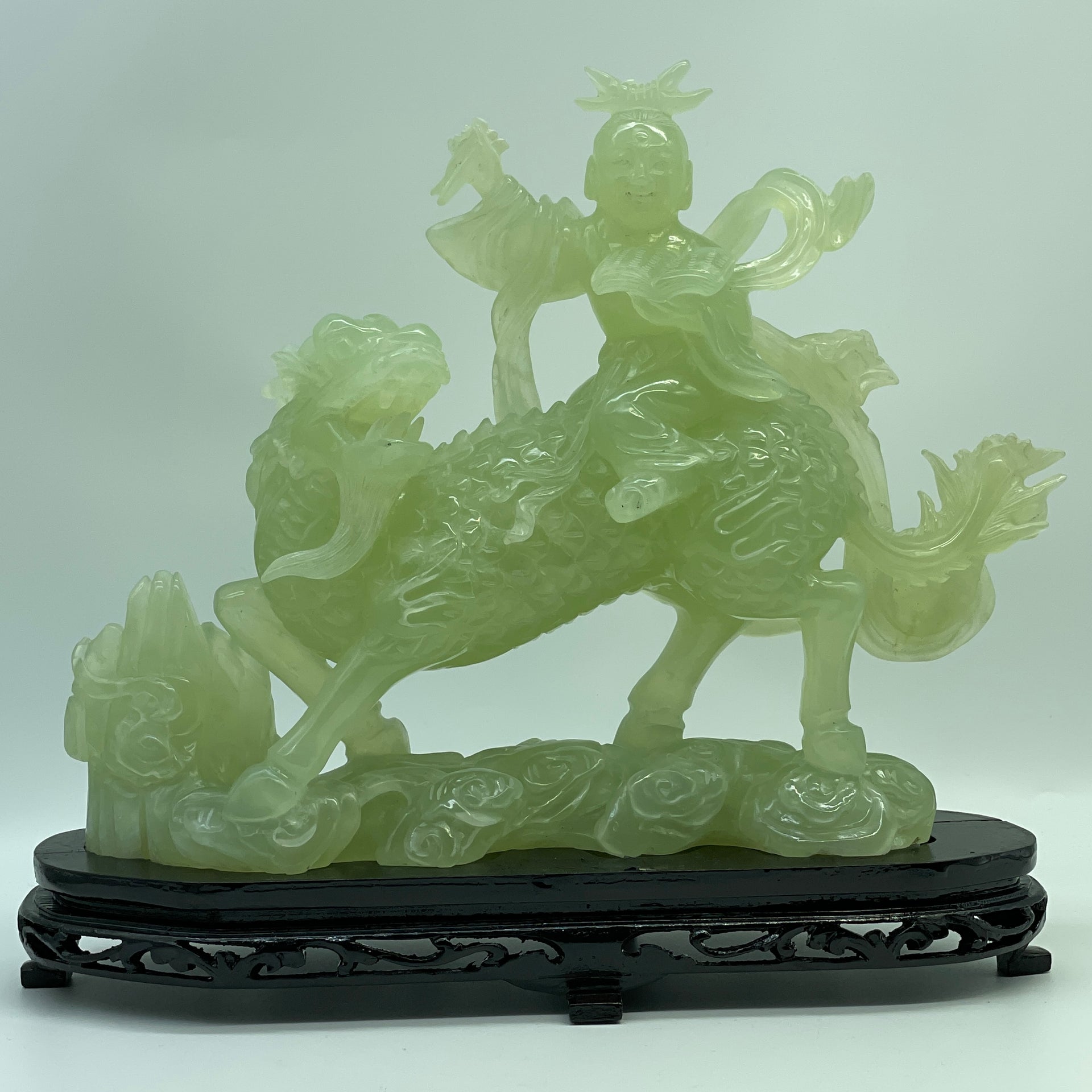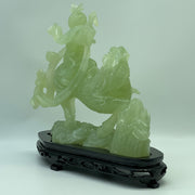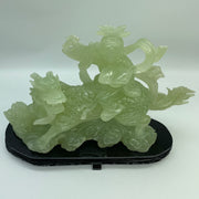 Natural Green Serpentine Nezha on QiLin on Mountain with Wooden Stand Display 3,139.0g 332.0 by 116.0 by 270.0mm