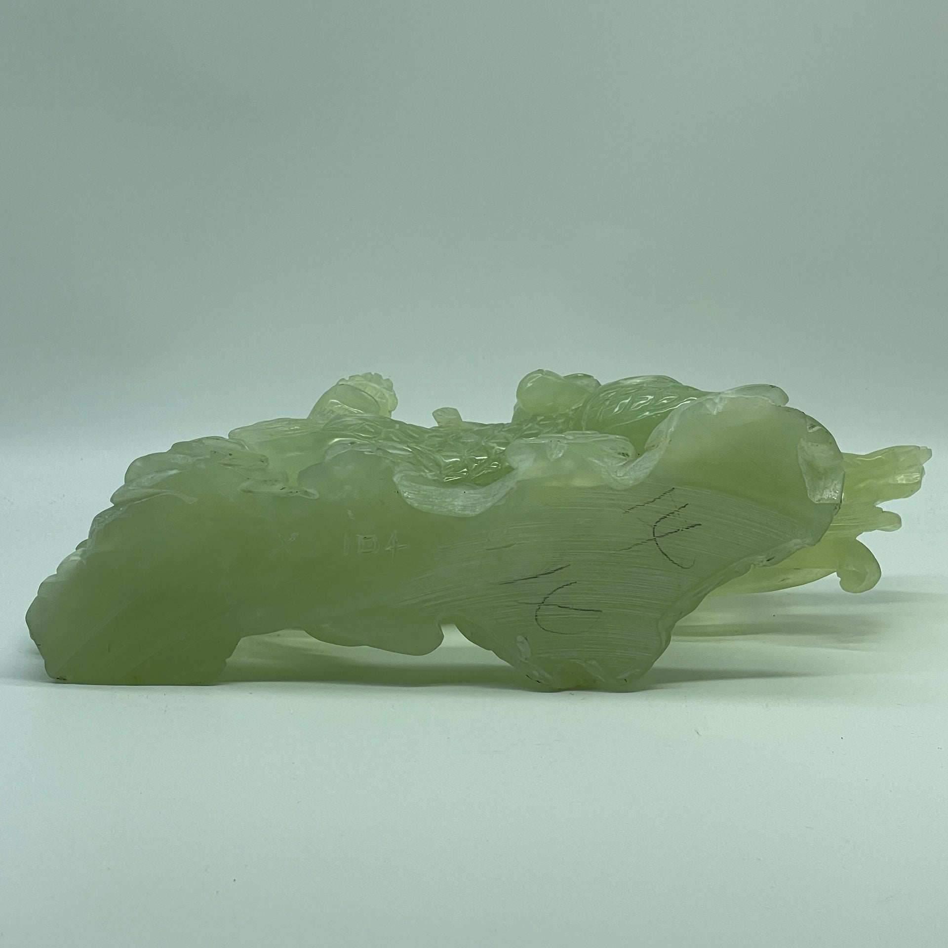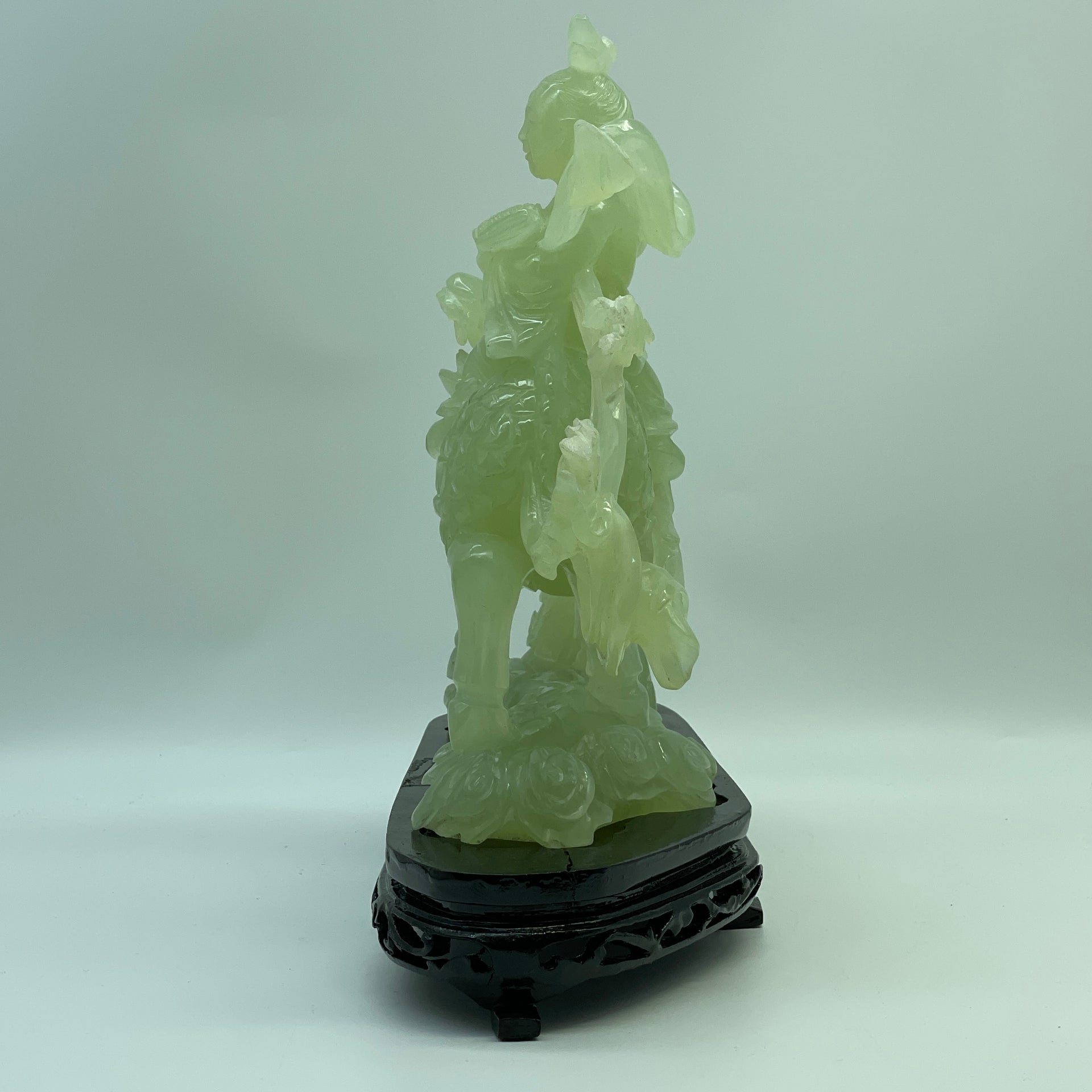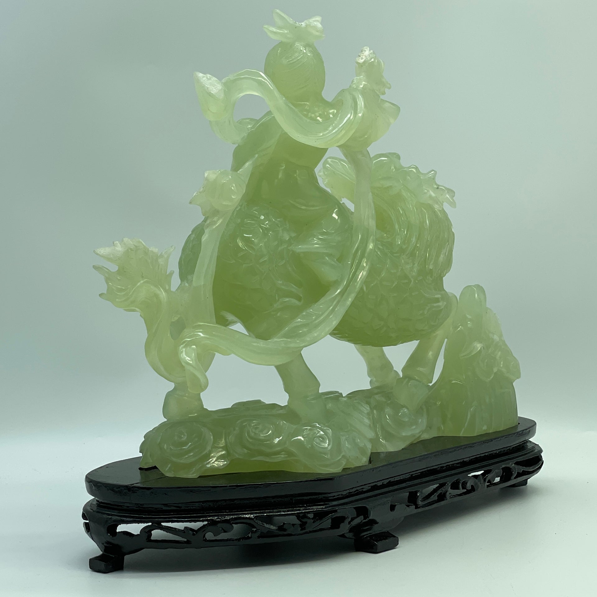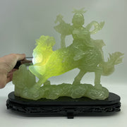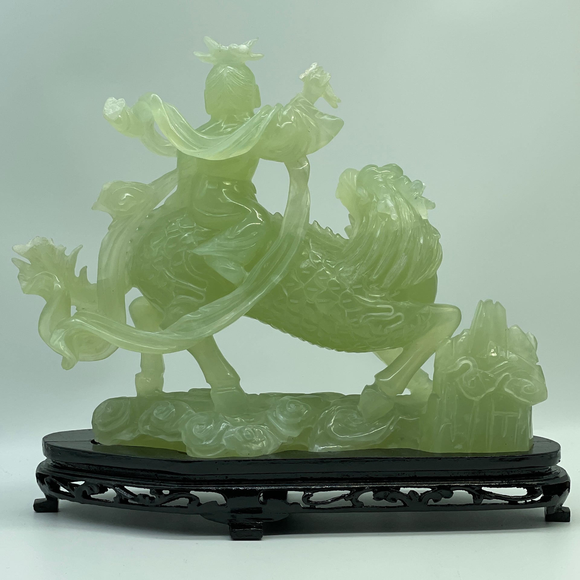 Natural Green Serpentine Nezha on QiLin on Mountain with Wooden Stand Display 3,139.0g 332.0 by 116.0 by 270.0mm