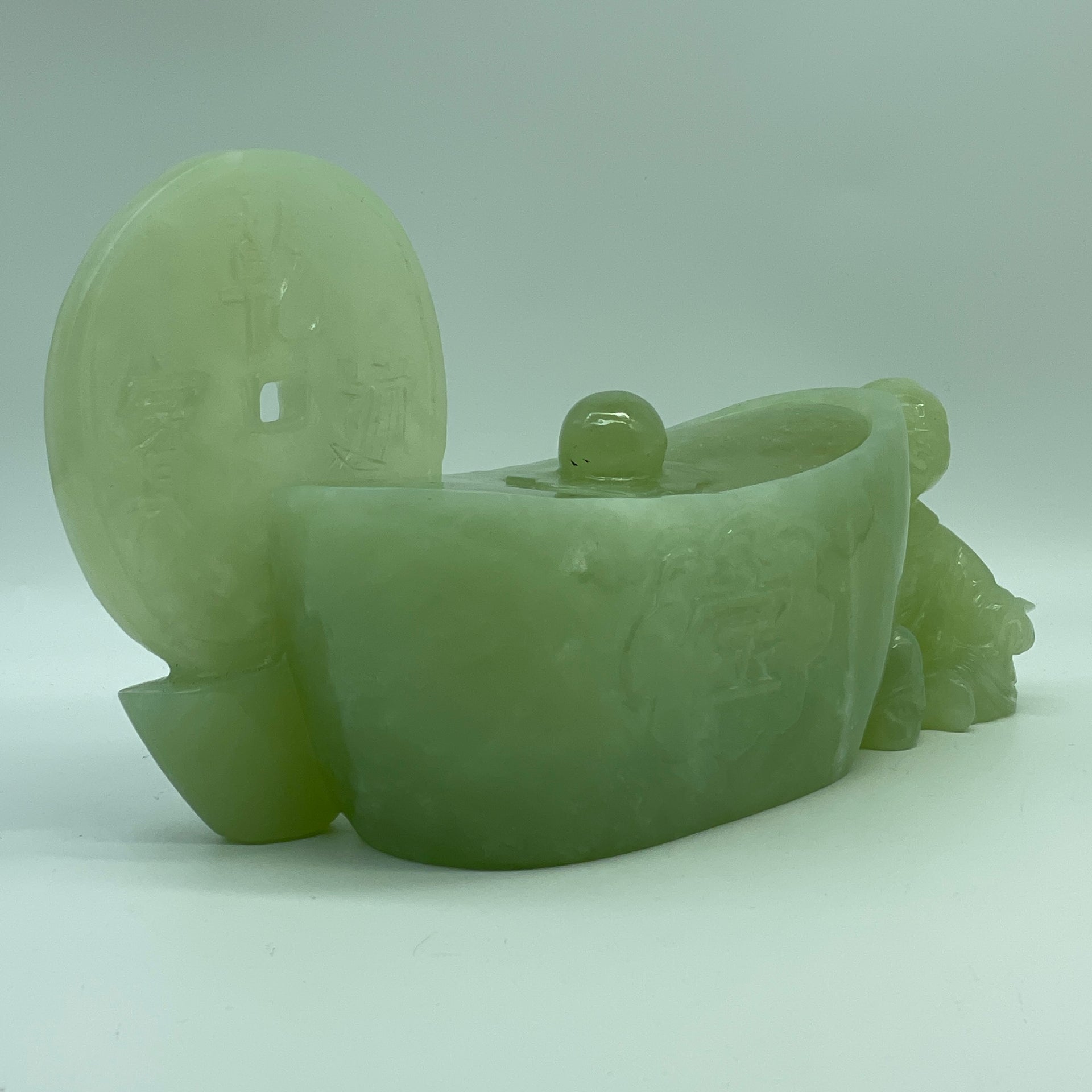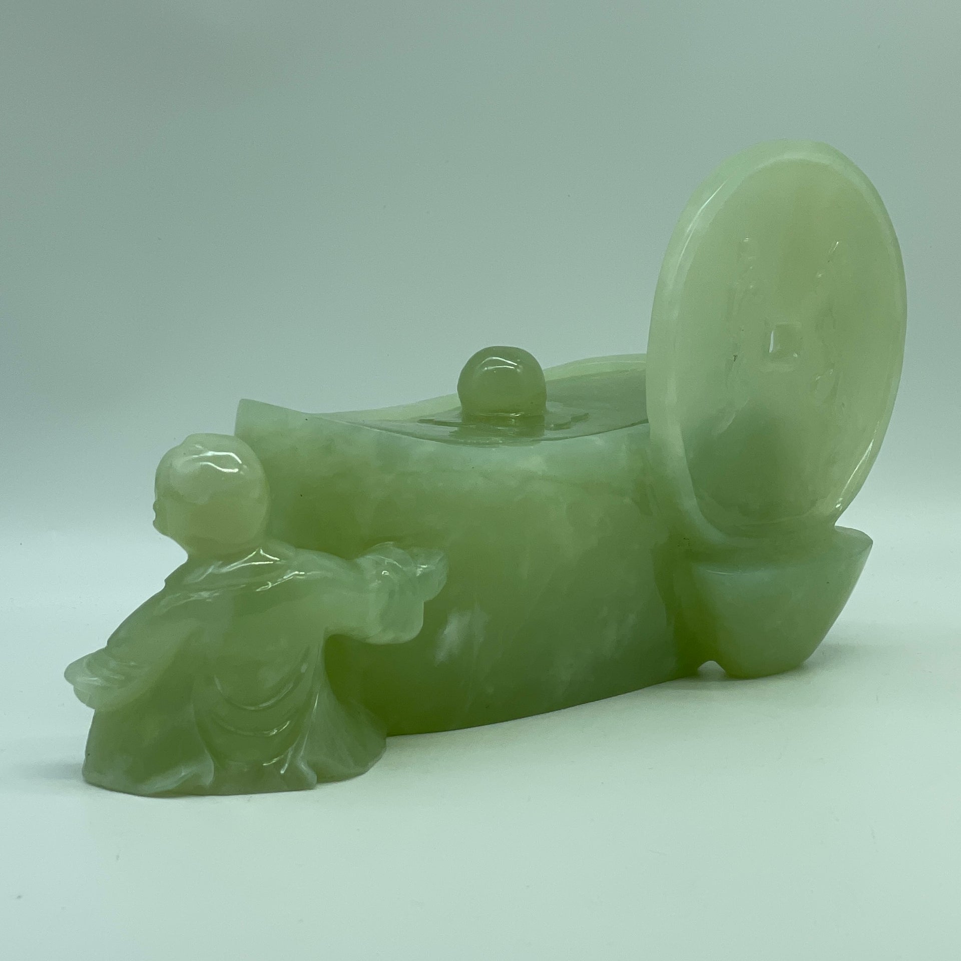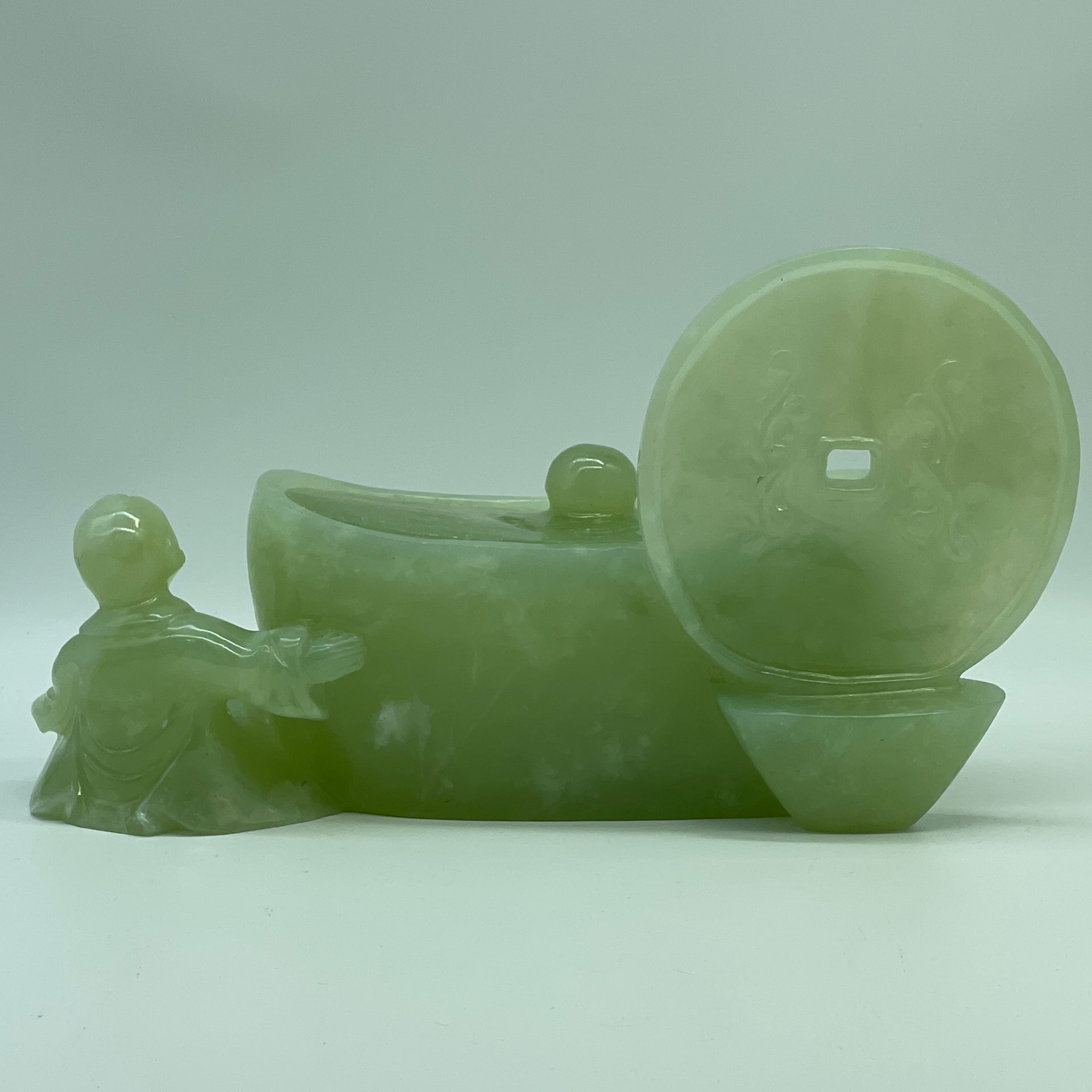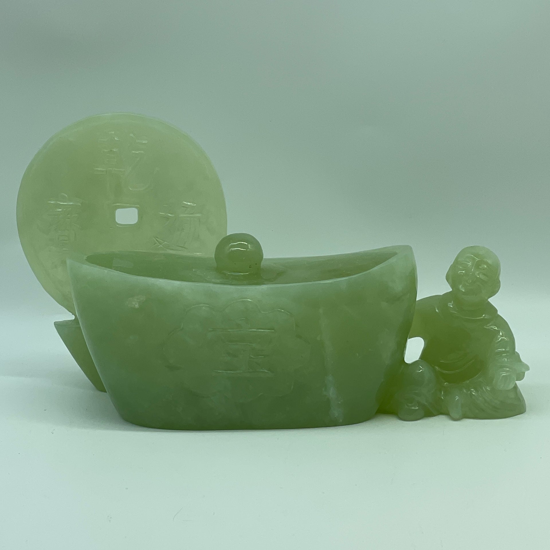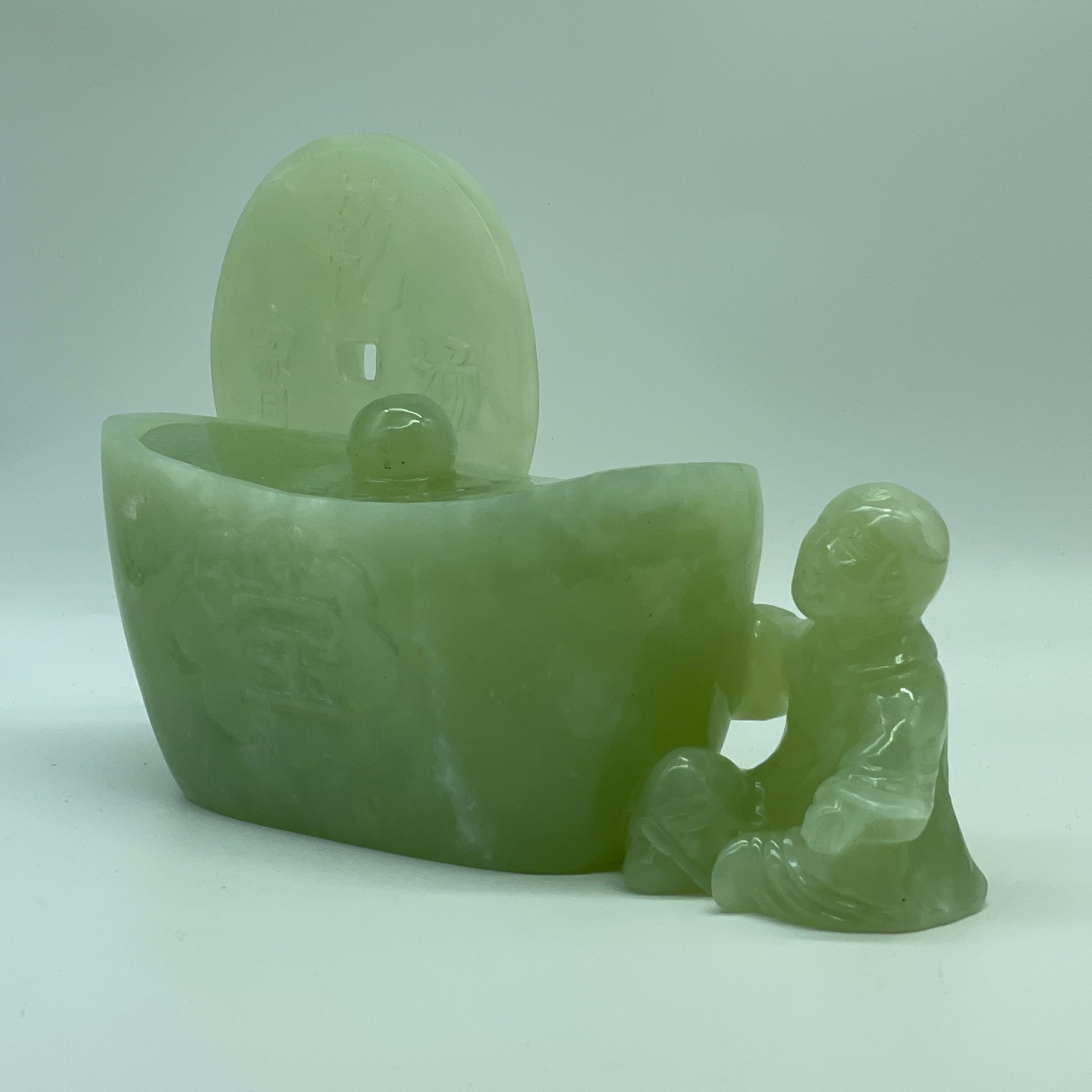 Natural Light Green Serpentine Yuan Bao Wealth Pot with Coin and Tong Zi Display 1,845.5g 260.0 by 90.0 by 140.0mm