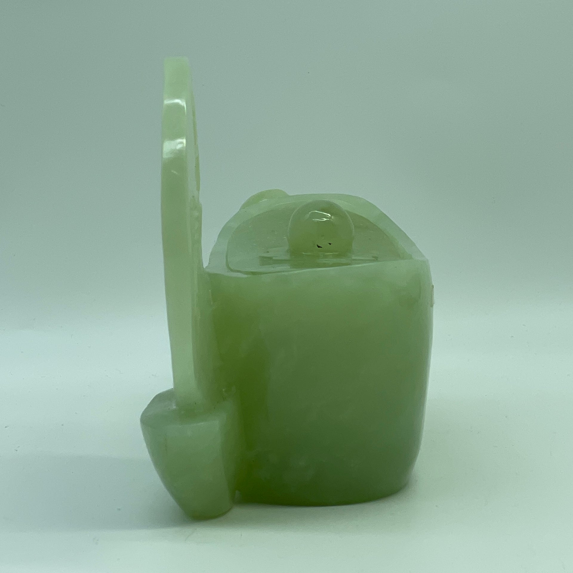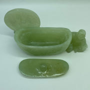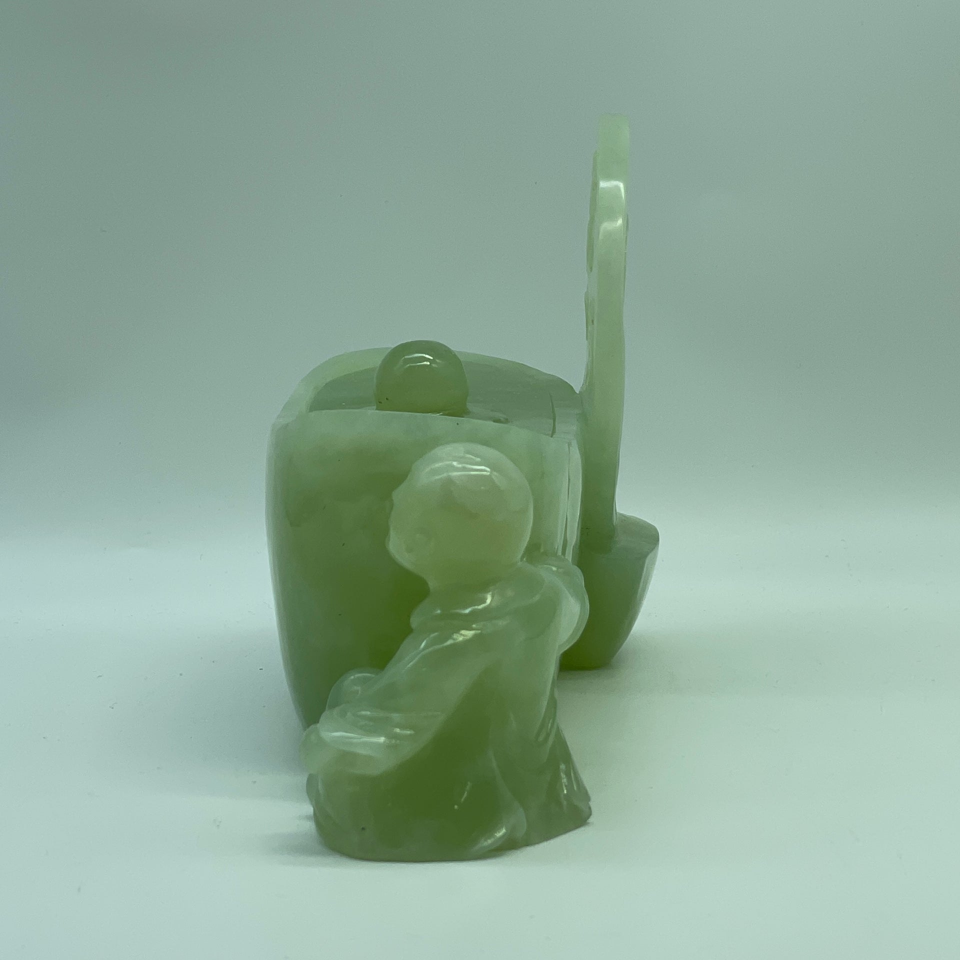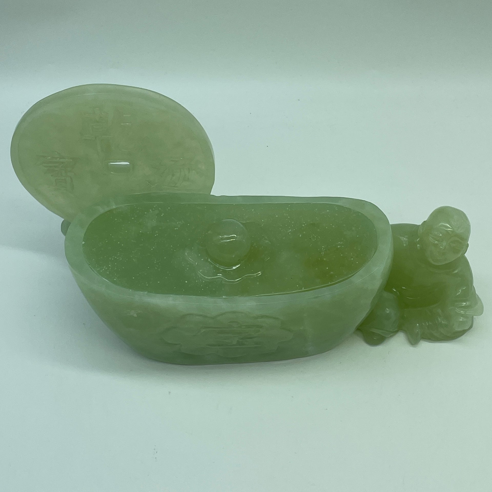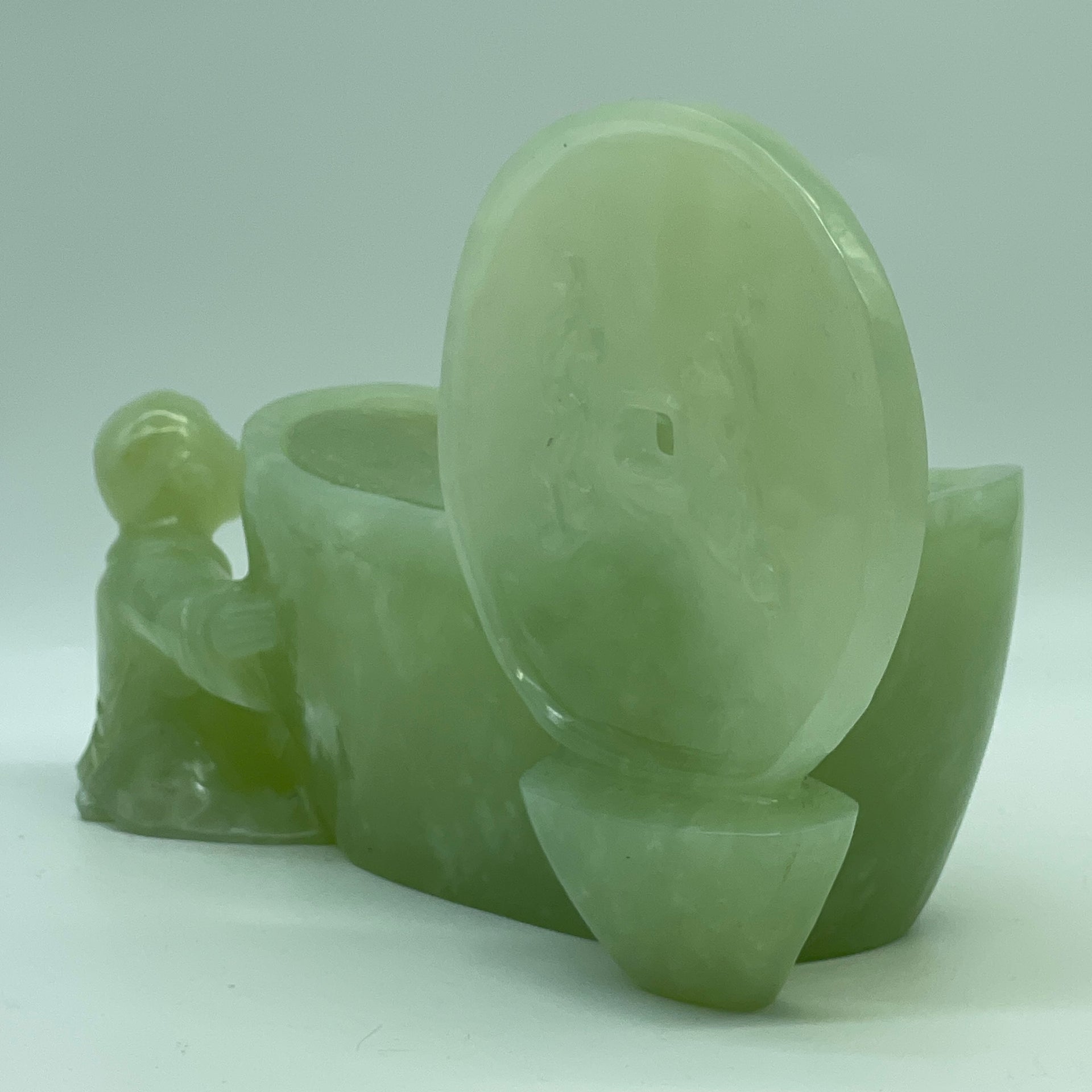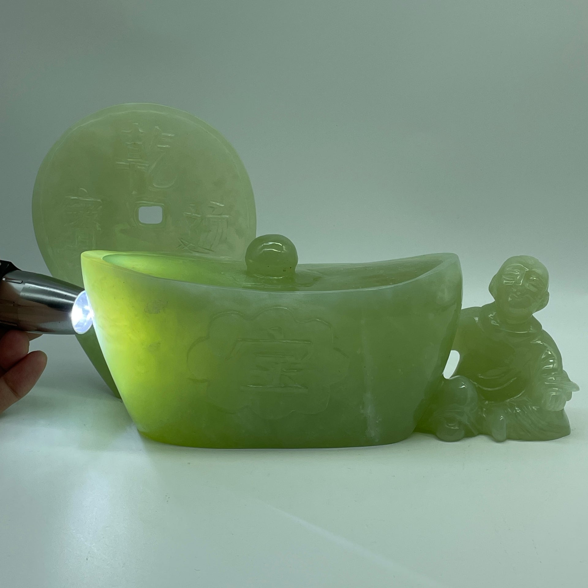 Natural Light Green Serpentine Yuan Bao Wealth Pot with Coin and Tong Zi Display 1,845.5g 260.0 by 90.0 by 140.0mm