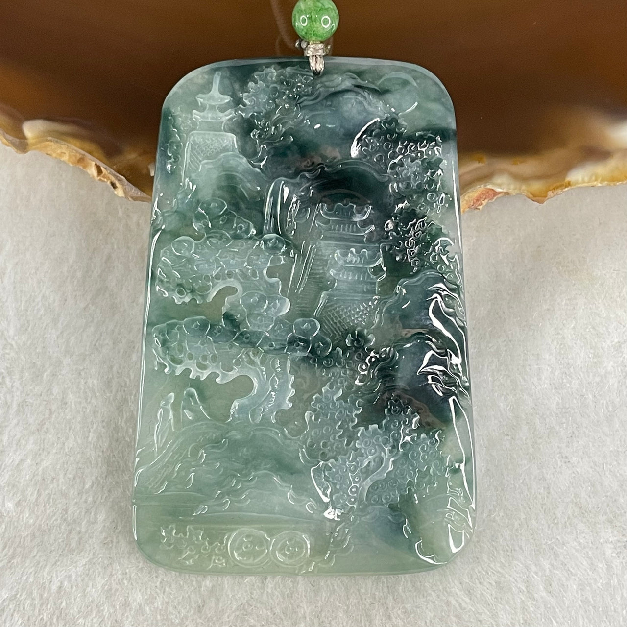高品质 A 型冰辣绿山水翡翠玉吊坠 - 28.42 克 65.6 x 37.9 x 6.6 毫米$7,695.00$7,695.00Unit price / per -