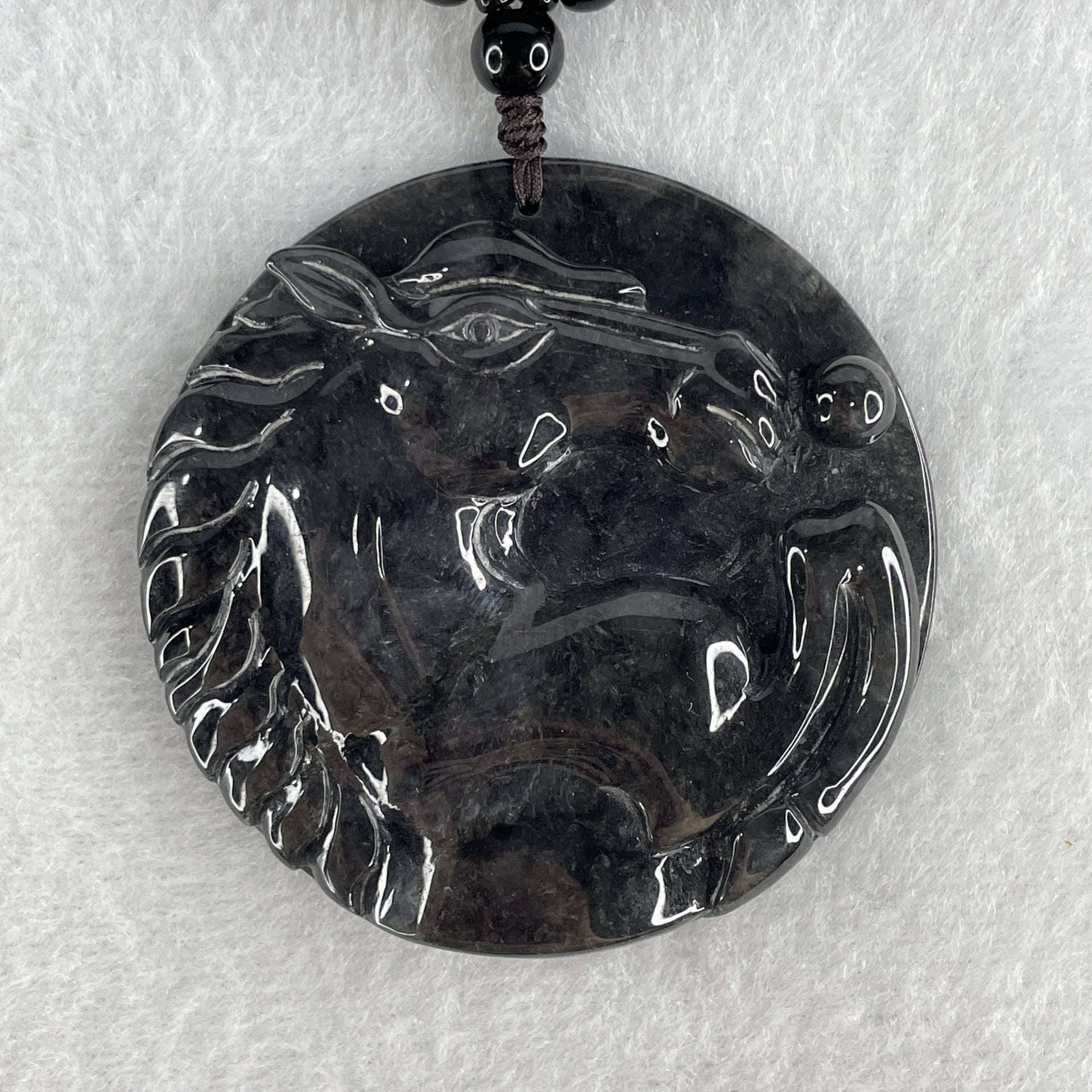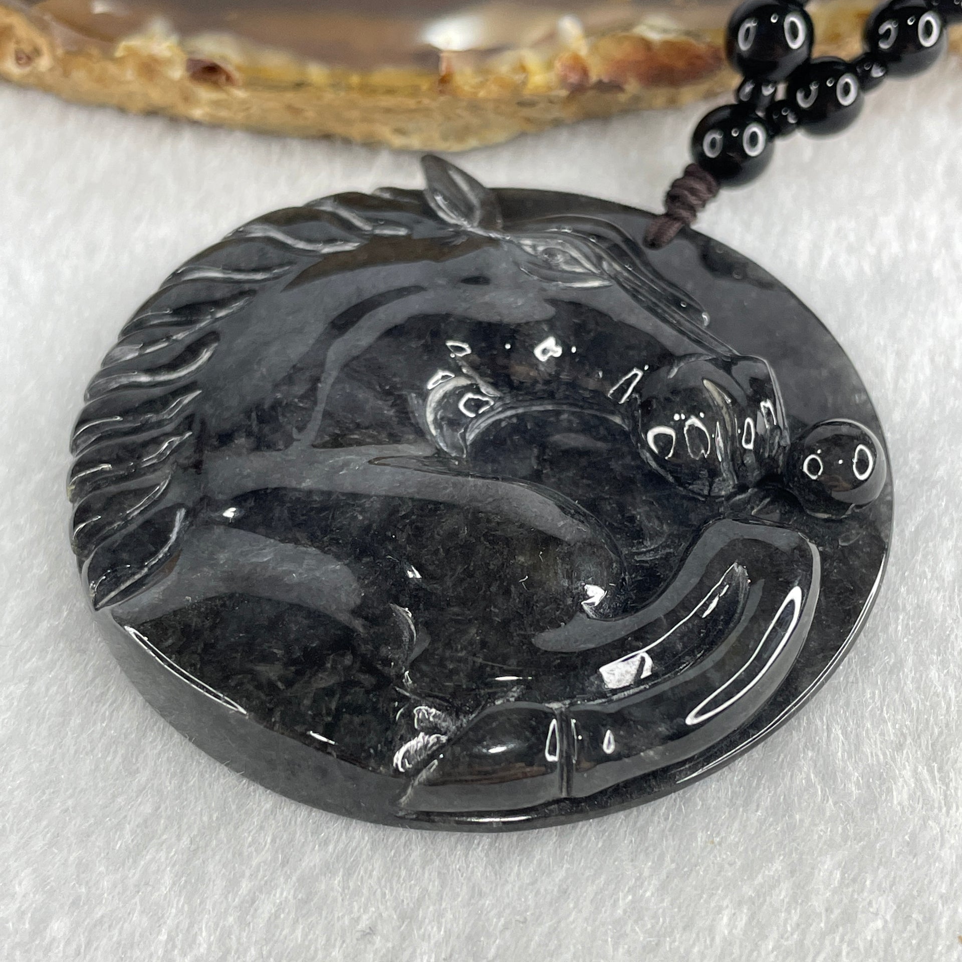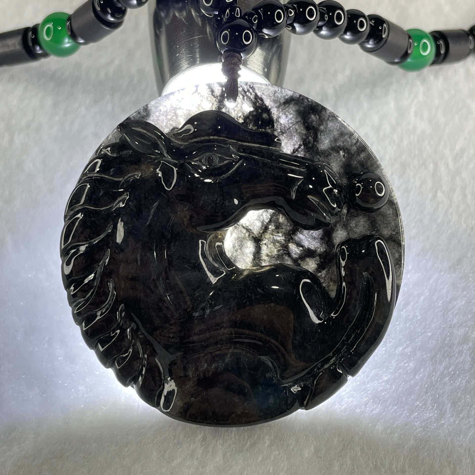 Natural Type A Translucent Wuji Grey Black Horse Pendant with Onyx and Green Agate Beads Necklace 38.92g 54.5 by 54.4 by 7.4mm