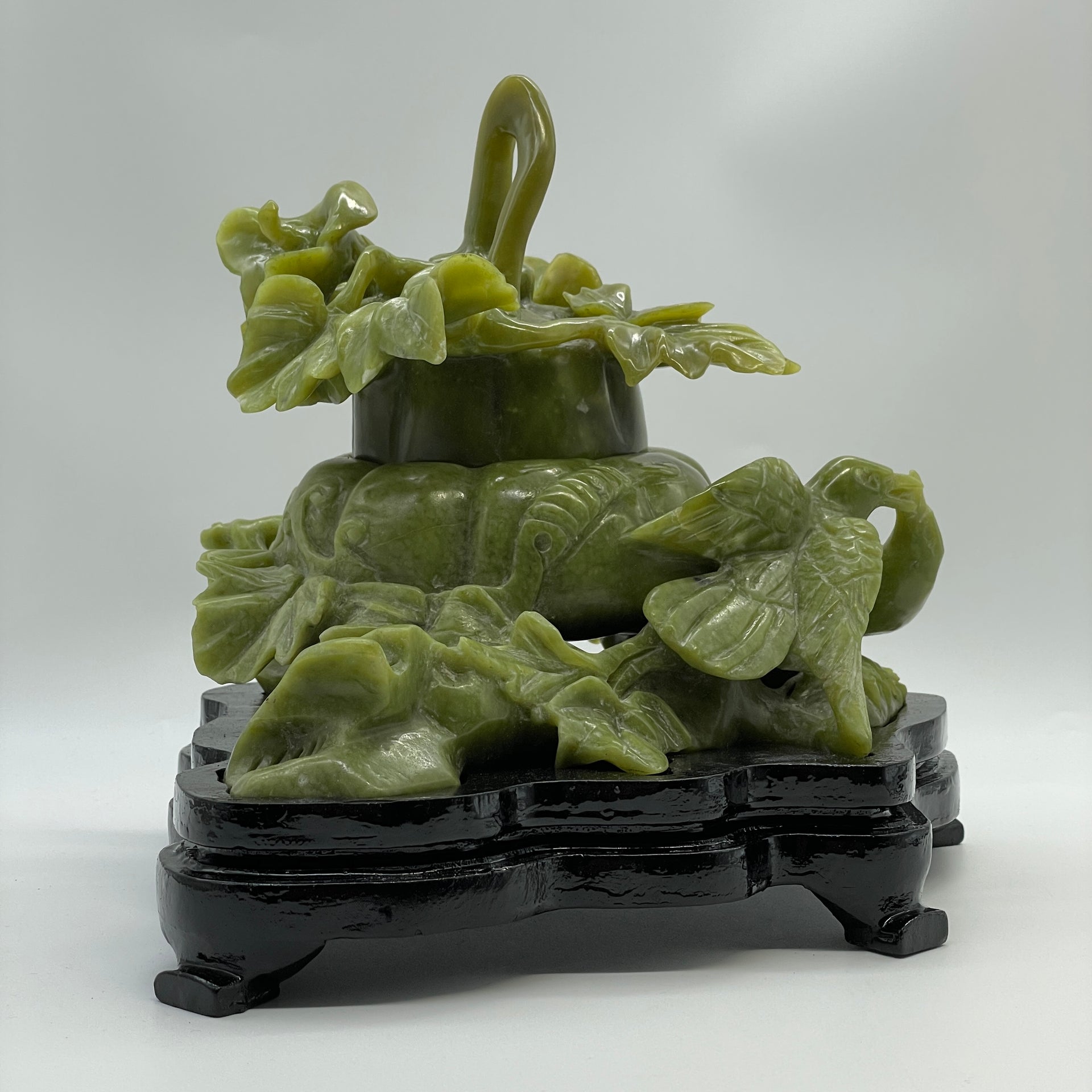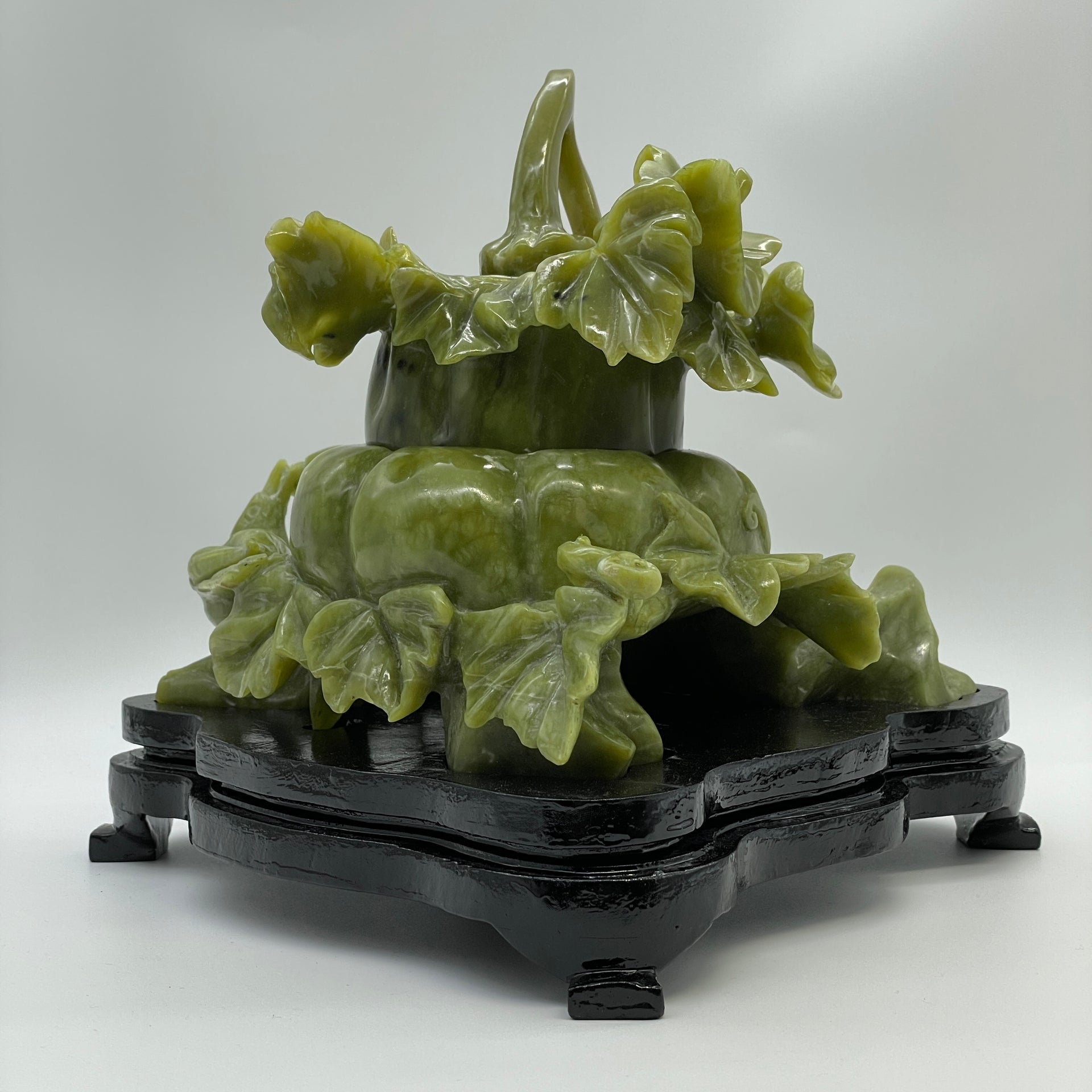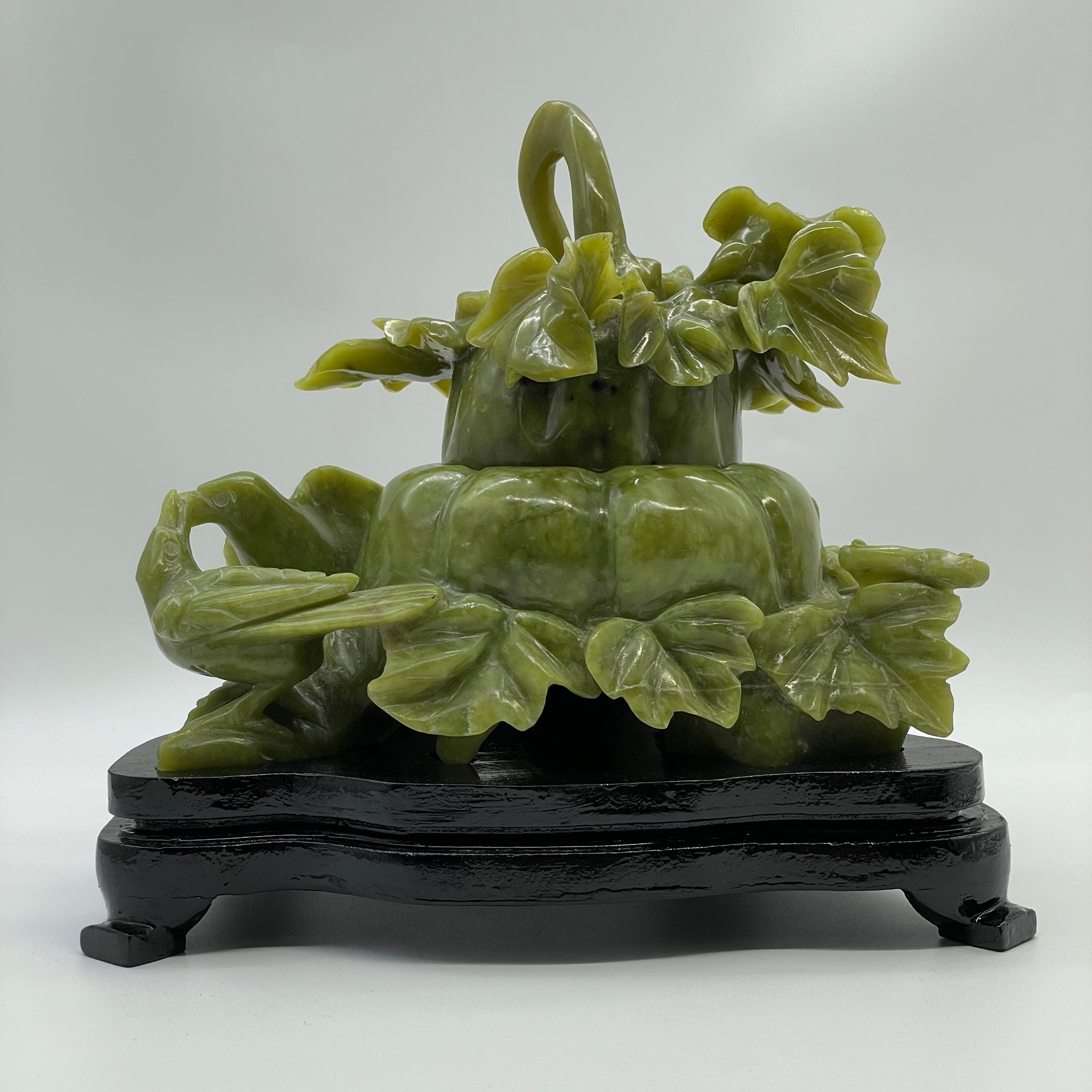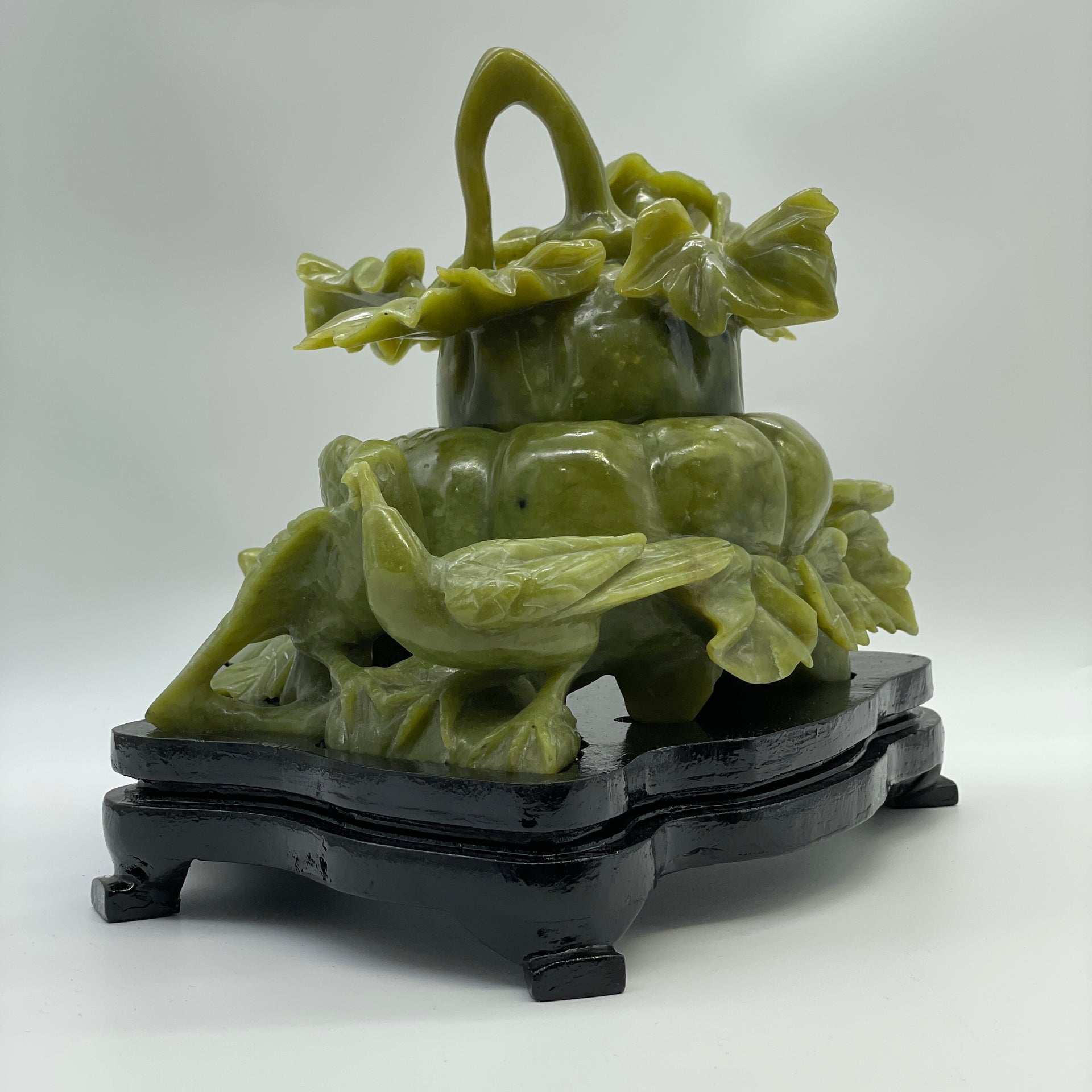 Natural Yellowish Green Serpentine Pumpkin with Twin Birds with Wooden Stand Display 3,622.3g 273.0 by 261.0 by 230.0mm